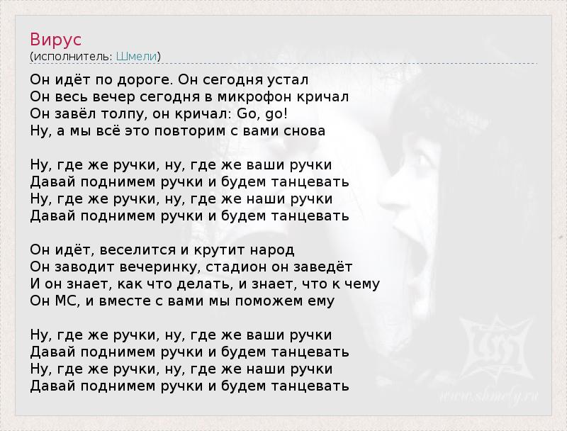 Он идёт по дороге. Он сегодня устал Он весь вечер сегодня в микрофон кричал Он завёл толпу, он кричал: Go, go! Ну, а мы всё это повторим с вами снова Ну, где же ручки, ну, где же ваши ручки Давай поднимем ручки и будем танцевать Ну, где же ручки, ну, где же наши ручки Давай поднимем ручки и будем танцевать Он идёт, веселится и крутит народ Он заводит вечеринку, стадион он заведёт И он знает, как что делать, и знает, что к чему Он MC, и вместе с вами мы поможем ему Ну, где же ручки, ну, где же ваши ручки Давай поднимем ручки и будем танцевать Ну, где же ручки, ну, где же наши ручки Давай поднимем ручки и будем танцевать