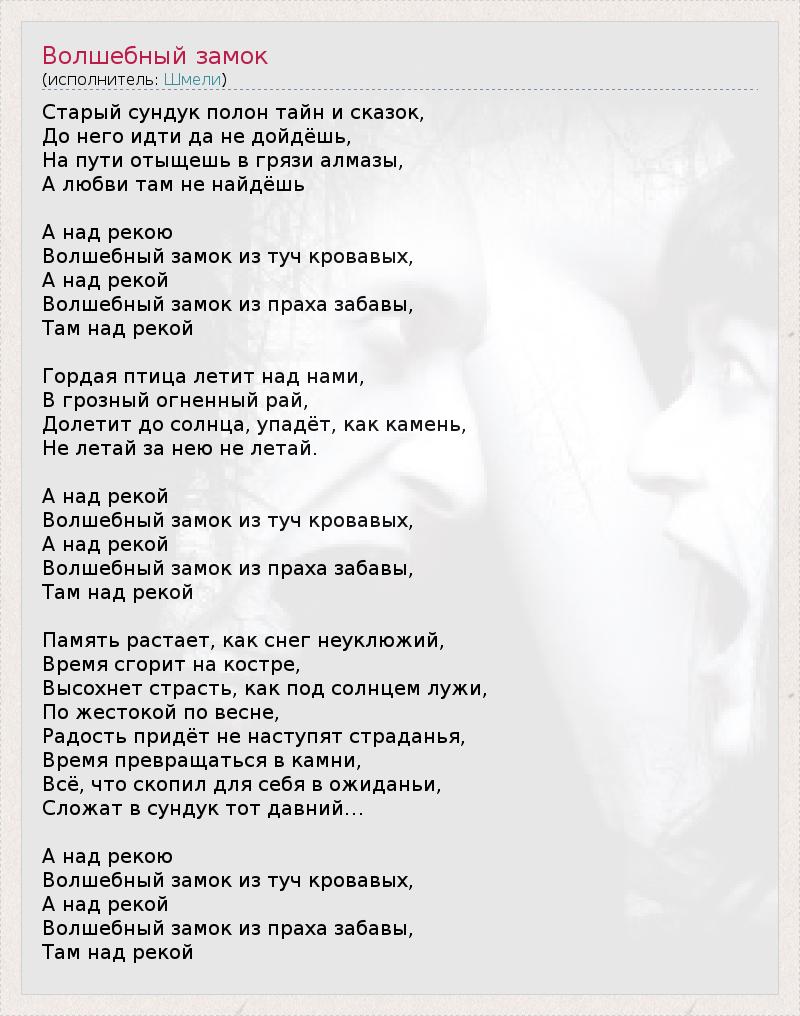 Старый сундук полон тайн и сказок, До него идти да не дойдёшь, На пути отыщешь в грязи алмазы, А любви там не найдёшь А над рекою Волшебный замок из туч кровавых, А над рекой Волшебный замок из праха забавы, Там над рекой Гордая птица летит над нами, В грозный огненный рай, Долетит до солнца, упадёт, как камень, Не летай за нею не летай. А над рекой Волшебный замок из туч кровавых, А над рекой Волшебный замок из праха забавы, Там над рекой Память растает, как снег неуклюжий, Время сгорит на костре, Высохнет страсть, как под солнцем лужи, По жестокой по весне, Радость придёт не наступят страданья, Время превращаться в камни, Всё, что скопил для себя в ожиданьи, Сложат в сундук тот давний… А над рекою Волшебный замок из туч кровавых, А над рекой Волшебный замок из праха забавы, Там над рекой