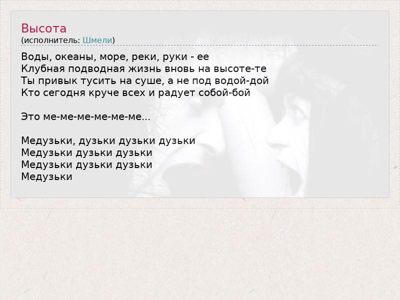 Water , ocean, sea , river , hands - it Club underwater life again at the height -cho You used to hang out on the land , not under water - Doi Who today coolest and pleases a -bout It's me- me- me- me- me- me ... Meduzki , duzki duzki duzki Meduzki duzki duzki Meduzki duzki duzki Meduzki