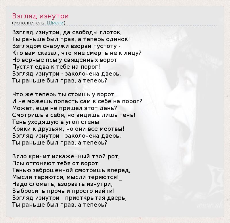 Взгляд изнутри, да свободы глоток, Ты раньше был прав, а теперь одинок! Взглядом снаружи взорви пустоту - Кто вам сказал, что мне смерть не к лицу? Но верные псы у священных ворот Пустят едва к тебе на порог! Взгляд изнутри - заколочена дверь. Ты раньше был прав, а теперь? Что же теперь ты стоишь у ворот И не можешь попасть сам к себе на порог? Может, еще не пришел этот день? Смотришь в себя, но видишь лишь тень! Тень уходящую в угол стены Крики к друзьям, но они все мертвы! Взгляд изнутри - заколочена дверь. Ты раньше был прав, а теперь? Вяло кричит искаженный твой рот, Псы отгоняют тебя от ворот. Тенью заброшенной смотришь вперед, Мысли теряются, мысли теряются!_ Надо сломать, взорвать изнутри, Выбросить прочь и просто найти! Взгляд изнутри - приоткрытая дверь, Ты раньше был прав, а теперь?