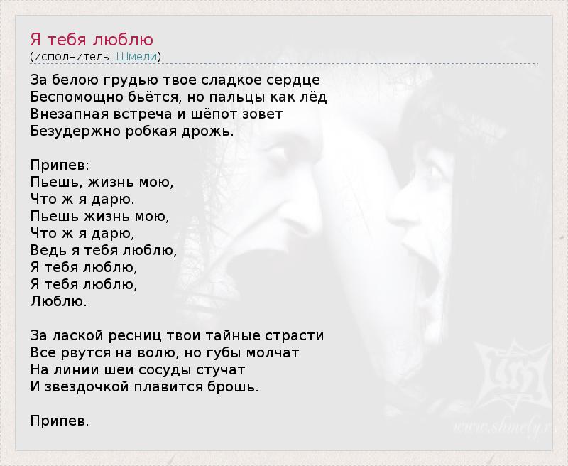 За белою грудью твое сладкое сердце Беспомощно бьётся, но пальцы как лёд Внезапная встреча и шёпот зовет Безудержно робкая дрожь. Припев: Пьешь, жизнь мою, Что ж я дарю. Пьешь жизнь мою, Что ж я дарю, Ведь я тебя люблю, Я тебя люблю, Я тебя люблю, Люблю. За лаской ресниц твои тайные страсти Все рвутся на волю, но губы молчат На линии шеи сосуды стучат И звездочкой плавится брошь. Припев.