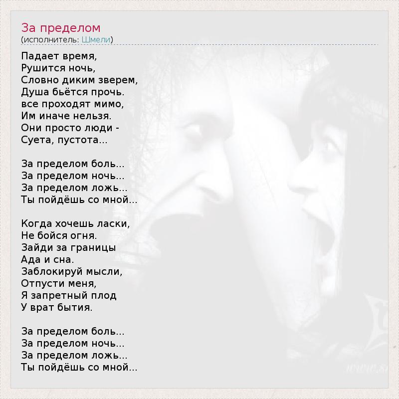 Падает время, Рушится ночь, Словно диким зверем, Душа бьётся прочь. все проходят мимо, Им иначе нельзя. Они просто люди - Суета, пустота... За пределом боль... За пределом ночь... За пределом ложь... Ты пойдёшь со мной... Когда хочешь ласки, Не бойся огня. Зайди за границы Ада и сна. Заблокируй мысли, Отпусти меня, Я запретный плод У врат бытия. За пределом боль... За пределом ночь... За пределом ложь... Ты пойдёшь со мной...