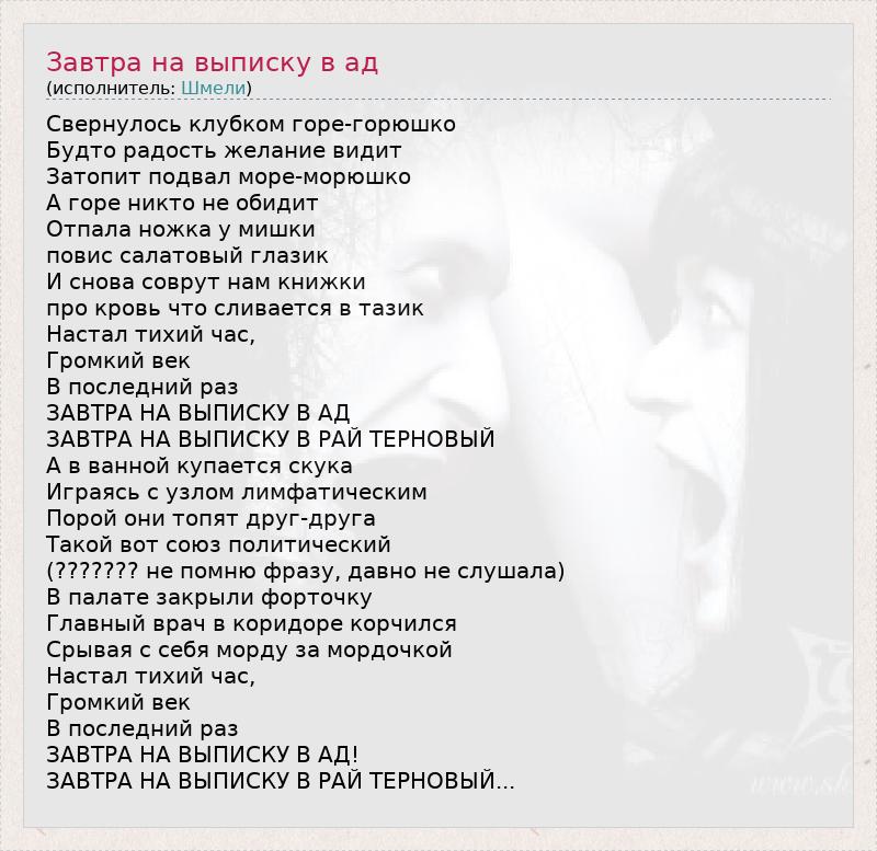 ГлавнаяИсполнителиШмелиЗавтра на выписку в ад