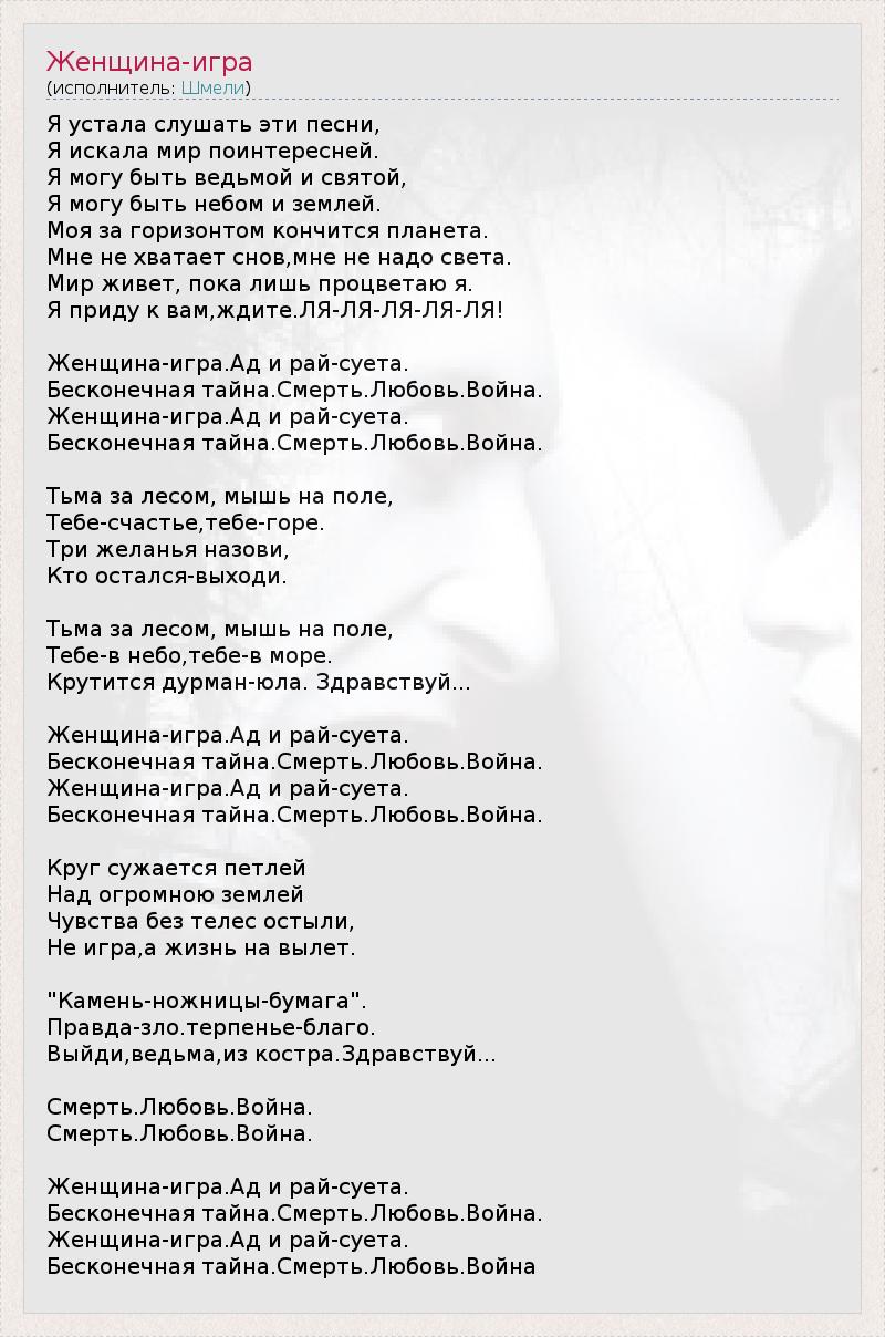 Я устала слушать эти песни, Я искала мир поинтересней. Я могу быть ведьмой и святой, Я могу быть небом и землей. Моя за горизонтом кончится планета. Мне не хватает снов,мне не надо света. Мир живет, пока лишь процветаю я. Я приду к вам,ждите.ЛЯ-ЛЯ-ЛЯ-ЛЯ-ЛЯ! Женщина-игра.Ад и рай-суета. Бесконечная тайна.Смерть.Любовь.Война. Женщина-игра.Ад и рай-суета. Бесконечная тайна.Смерть.Любовь.Война. Тьма за лесом, мышь на поле, Тебе-счастье,тебе-горе. Три желанья назови, Кто остался-выходи. Тьма за лесом, мышь на поле, Тебе-в небо,тебе-в море. Крутится дурман-юла. Здравствуй... Женщина-игра.Ад и рай-суета. Бесконечная тайна.Смерть.Любовь.Война. Женщина-игра.Ад и рай-суета. Бесконечная тайна.Смерть.Любовь.Война. Круг сужается петлей Над огромною землей Чувства без телес остыли, Не игра,а жизнь на вылет. "Камень-ножницы-бумага". Правда-зло.терпенье-благо. Выйди,ведьма,из костра.Здравствуй... Смерть.Любовь.Война. Смерть.Любовь.Война. Женщина-игра.Ад и рай-суета. Бесконечная тайна.Смерть.Любовь.Война. Женщина-игра.Ад и рай-суета. Бесконечная тайна.Смерть.Любовь.Война