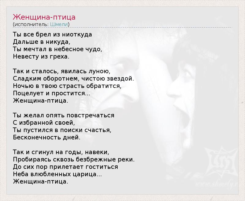 Ты все брел из ниоткуда Дальше в никуда, Ты мечтал в небесное чудо, Невесту из греха. Так и сталось, явилась луною, Сладким оборотнем, чистою звездой. Ночью в твою страсть обратится, Поцелует и простится... Женщина-птица. Ты желал опять повстречаться С избранной своей, Ты пустился в поиски счастья, Бесконечность дней. Так и сгинул на годы, навеки, Пробираясь сквозь безбрежные реки. До сих пор прилетает гоститься Неба влюбленных царица... Женщина-птица.