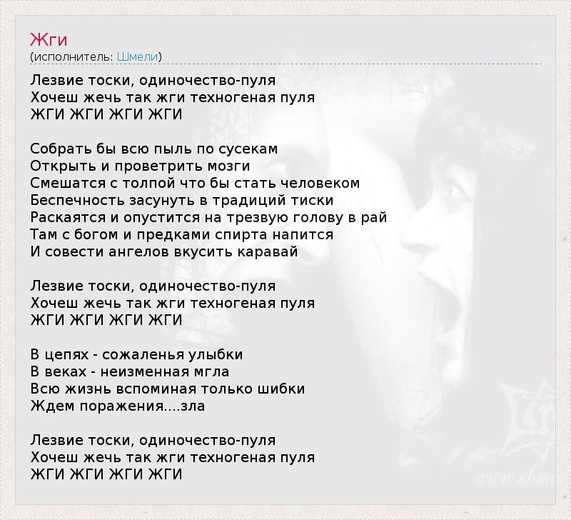 Лезвие тоски, одиночество-пуля Хочеш жечь так жги техногеная пуля ЖГИ ЖГИ ЖГИ ЖГИ Собрать бы всю пыль по сусекам Открыть и проветрить мозги Смешатся с толпой что бы стать человеком Беспечность засунуть в традиций тиски Раскаятся и опустится на трезвую голову в рай Там с богом и предками спирта напится И совести ангелов вкусить каравай Лезвие тоски, одиночество-пуля Хочеш жечь так жги техногеная пуля ЖГИ ЖГИ ЖГИ ЖГИ В цепях - сожаленья улыбки В веках - неизменная мгла Всю жизнь вспоминая только шибки Ждем поражения....зла Лезвие тоски, одиночество-пуля Хочеш жечь так жги техногеная пуля ЖГИ ЖГИ ЖГИ ЖГИ