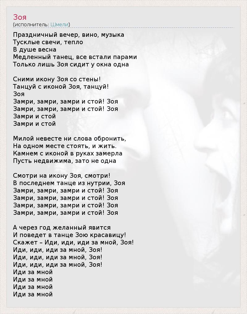 Праздничный вечер, вино, музыка Тусклые свечи, тепло В душе весна Медленный танец, все встали парами Только лишь Зоя сидит у окна одна Сними икону Зоя со стены! Танцуй с иконой Зоя, танцуй! Зоя Замри, замри, замри и стой! Зоя Замри, замри, замри и стой! Зоя Замри и стой Замри и стой Милой невесте ни слова обронить, На одном месте стоять, и жить. Камнем с иконой в руках замерла Пусть недвижима, зато не одна Смотри на икону Зоя, смотри! В последнем танце из нутрии, Зоя Замри, замри, замри и стой! Зоя Замри, замри, замри и стой! Зоя Замри, замри, замри и стой! Зоя Замри, замри, замри и стой! Зоя А через год желанный явится И поведет в танце Зою красавицу! Скажет – Иди, иди, иди за мной, Зоя! Иди, иди, иди за мной, Зоя! Иди, иди, иди за мной, Зоя! Иди, иди, иди за мной, Зоя! Иди за мной Иди за мной Иди за мной Иди за мной