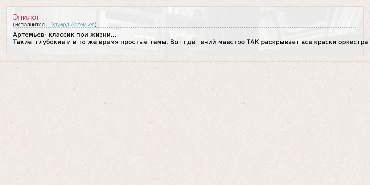 Это интересно:Эдуард Николаевич Артемьев (родился 30 ноября 1937 года в Новосибирске) — русский советский композитор в жанре электронной музыки. Известен, в частности, как автор музыки к фильмам Андрея Тарковского, Никиты Михалкова и Андрея Кончаловского. Живёт и работает в Москве. Отец Артемия Артемьева — музыканта и владельца лэйбла «Электрошок Рекордз». Мэтр российской и советской электронной музыки.Артемьев... продолжение