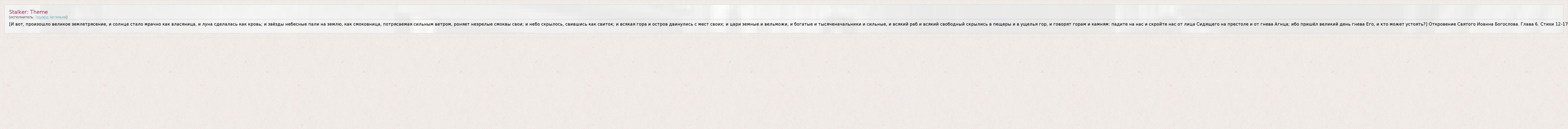 [И вот, произошло великое землетрясение, и солнце стало мрачно как власяница, и луна сделалась как кровь; и звёзды небесные пали на землю, как смоковница, потрясаемая сильным ветром, роняет незрелые смоквы свои; и небо скрылось, свившись как свиток; и всякая гора и остров двинулись с мест своих; и цари земные и вельможи, и богатые и тысяченачальники и сильные, и всякий раб и всякий свободный скрылись в пещеры и в ущелья гор, и говорят горам и камням: падите на нас и скройте нас от лица Сидящего на престоле и от гнева Агнца; ибо пришёл великий день гнева Его, и кто может устоять?] Откровение Святого Иоанна Богослова. Глава 6. Стихи 12-17