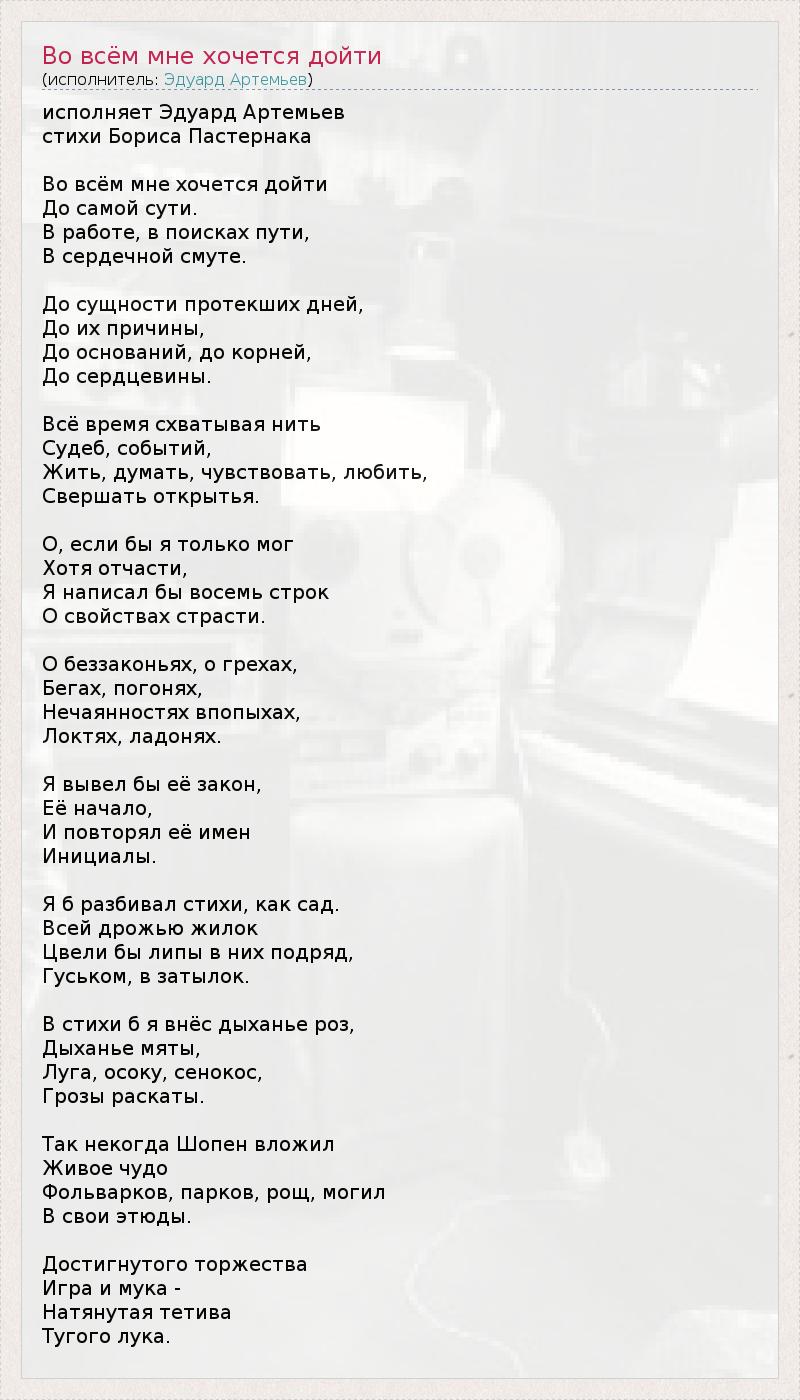 исполняет Эдуард Артемьев стихи Бориса Пастернака Во всём мне хочется дойти До самой сути. В работе, в поисках пути, В сердечной смуте. До сущности протекших дней, До их причины, До оснований, до корней, До сердцевины. Всё время схватывая нить Судеб, событий, Жить, думать, чувствовать, любить, Свершать открытья. О, если бы я только мог Хотя отчасти, Я написал бы восемь строк О свойствах страсти. О беззаконьях, о грехах, Бегах, погонях, Нечаянностях впопыхах, Локтях, ладонях. Я вывел бы её закон, Её начало, И повторял её имен Инициалы. Я б разбивал стихи, как сад. Всей дрожью жилок Цвели бы липы в них подряд, Гуськом, в затылок. В стихи б я внёс дыханье роз, Дыханье мяты, Луга, осоку, сенокос, Грозы раскаты. Так некогда Шопен вложил Живое чудо Фольварков, парков, рощ, могил В свои этюды. Достигнутого торжества Игра и мука - Натянутая тетива Тугого лука.