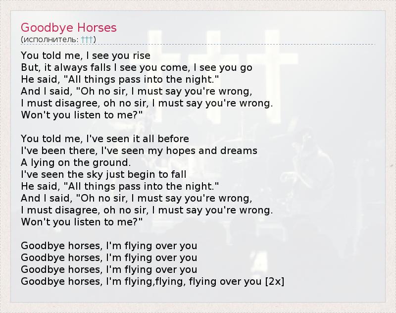 You told me, I see you rise But, it always falls I see you come, I see you go He said, "All things pass into the night." And I said, "Oh no sir, I must say you're wrong, I must disagree, oh no sir, I must say you're wrong. Won't you listen to me?" You told me, I've seen it all before I've been there, I've seen my hopes and dreams A lying on the ground. I've seen the sky just begin to fall He said, "All things pass into the night." And I said, "Oh no sir, I must say you're wrong, I must disagree, oh no sir, I must say you're wrong. Won't you listen to me?" Goodbye horses, I'm flying over you Goodbye horses, I'm flying over you Goodbye horses, I'm flying over you Goodbye horses, I'm flying,flying, flying over you [2x]