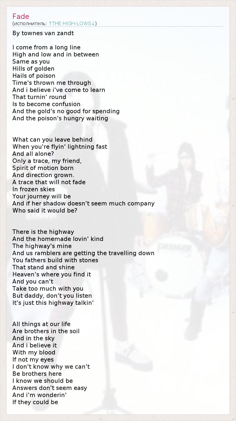 By townes van zandt I come from a long line High and low and in between Same as you Hills of golden Hails of poison Time's thrown me through And i believe i've come to learn That turnin' round Is to become confusion And the gold's no good for spending And the poison's hungry waiting What can you leave behind When you're flyin' lightning fast And all alone? Only a trace, my friend, Spirit of motion born And direction grown. A trace that will not fade In frozen skies Your journey will be And if her shadow doesn't seem much company Who said it would be? There is the highway And the homemade lovin' kind The highway's mine And us ramblers are getting the travelling down You fathers build with stones That stand and shine Heaven's where you find it And you can't Take too much with you But daddy, don't you listen It's just this highway talkin' All things at our life Are brothers in the soil And in the sky And i believe it With my blood If not my eyes I don't know why we can't Be brothers here I know we should be Answers don't seem easy And i'm wonderin' If they could be