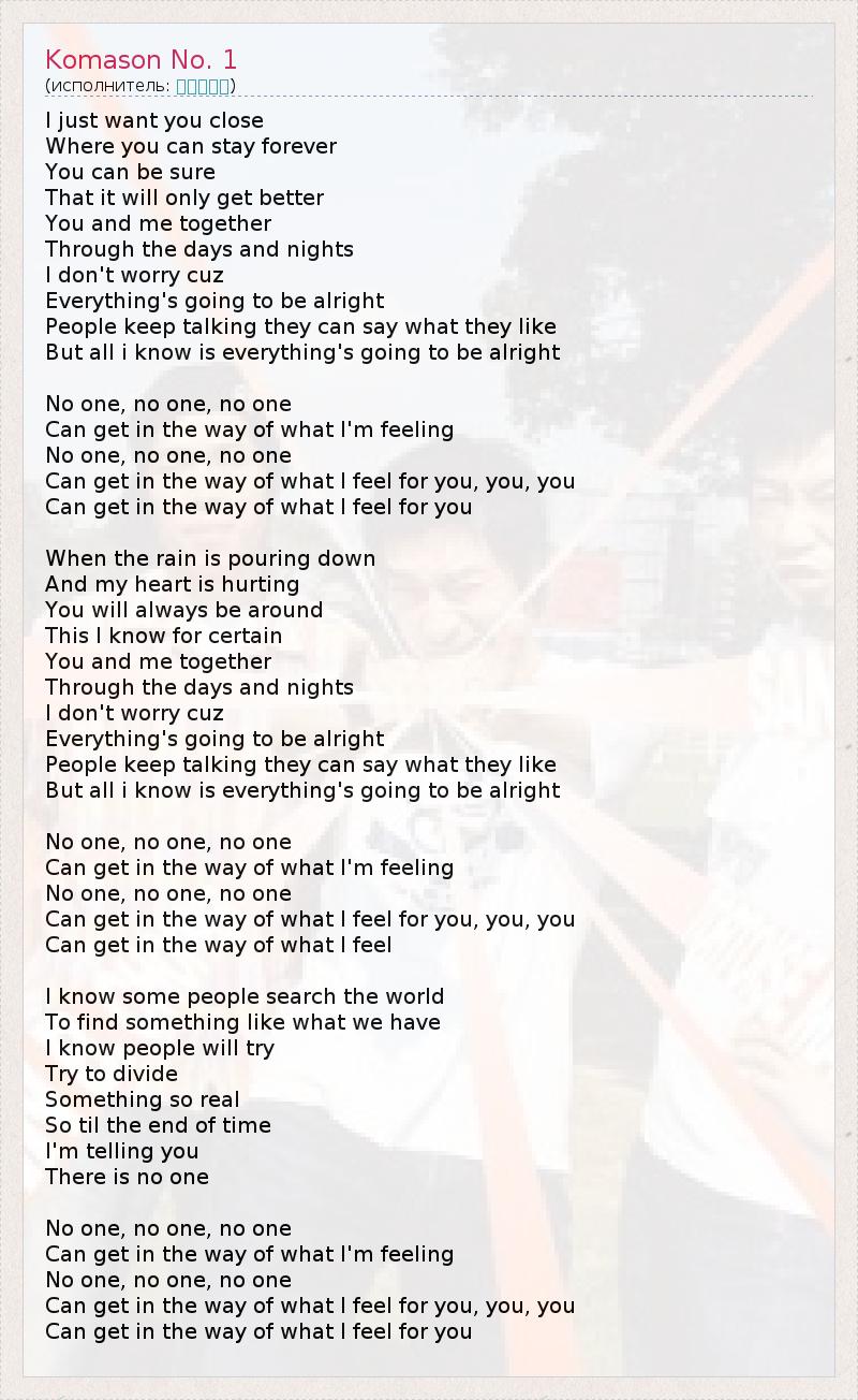 Я просто хочу, чтобы ты был рядом, Рядом со мной навсегда. Будь уверен, Что отношения между нами Будут становиться только лучше С каждым днём и с каждой ночью… Я не беспокоюсь на этот счёт, Потому что знаю, что всё будет хорошо. Люди сплетничают о нас, пусть говорят, что им хочется, Ведь я-то знаю, что всё будет хорошо. Никто, никто, никто Не встанет на пути моих чувств. Никто, никто, никто Не встанет на пути моих чувств к тебе, Не встанет на пути моих чувств к тебе. Если дождь будет стеной, И если мне будет трудно, Ты всегда будешь рядом. Я знаю это наверняка – Ты и я будем вместе, Днём и ночью. Я не беспокоюсь на этот счёт, Потому что знаю, что всё будет хорошо. Люди сплетничают о нас, пусть говорят, что им хочется, Ведь я-то знаю, что всё будет хорошо. Никто, никто, никто Не встанет на пути моих чувств. Никто, никто, никто Не встанет на пути моих чувств к тебе, Не встанет на пути моих чувств к тебе. Я знаю людей, которые скитаются по свету, Только чтобы найти то, что есть у нас с тобой, Они хотят научиться Отличать настоящие чувства От подделок. До скончания времён, Говорю тебе, Никто… Никто, никто, никто Не встанет на пути моих чувств. Никто, никто, никто Не встанет на пути моих чувств к тебе, Не встанет на пути моих чувств к тебе.
