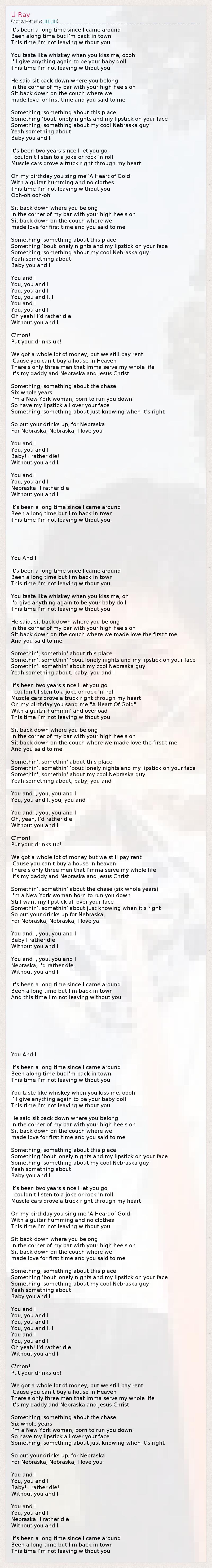It's been a long time since I came around Been along time but I'm back in town This time I'm not leaving without you You taste like whiskey when you kiss me, oooh I'll give anything again to be your baby doll This time I'm not leaving without you He said sit back down where you belong In the corner of my bar with your high heels on Sit back down on the couch where we made love for first time and you said to me Something, something about this place Something 'bout lonely nights and my lipstick on your face Something, something about my cool Nebraska guy Yeah something about Baby you and I It's been two years since I let you go, I couldn't listen to a joke or rock 'n roll Muscle cars drove a truck right through my heart On my birthday you sing me 'A Heart of Gold' With a guitar humming and no clothes This time I'm not leaving without you Ooh-oh ooh-oh Sit back down where you belong In the corner of my bar with your high heels on Sit back down on the couch where we made love for first time and you said to me Something, something about this place Something 'bout lonely nights and my lipstick on your face Something, something about my cool Nebraska guy Yeah something about Baby you and I You and I You, you and I You, you and I You, you and I, I You and I You, you and I Oh yeah! I'd rather die Without you and I C'mon! Put your drinks up! We got a whole lot of money, but we still pay rent 'Cause you can't buy a house in Heaven There's only three men that Imma serve my whole life It's my daddy and Nebraska and Jesus Christ Something, something about the chase Six whole years I'm a New York woman, born to run you down So have my lipstick all over your face Something, something about just knowing when it's right So put your drinks up, for Nebraska For Nebraska, Nebraska, I love you You and I You, you and I Baby! I rather die! Without you and I You and I You, you and I Nebraska! I rather die Without you and I It's been a long time since I came around Been a long time but I'm back in town This time I'm not leaving without you. You And I It's been a long time since I came around Been a long time but I'm back in town This time I'm not leaving without you. You taste like whiskey when you kiss me, oh I'd give anything again to be your baby doll This time I'm not leaving without you He said, sit back down where you belong In the corner of my bar with your high heels on Sit back down on the couch where we made love the first time And you said to me Somethin', somethin' about this place Somethin', somethin' 'bout lonely nights and my lipstick on your face Somethin', somethin' about my cool Nebraska guy Yeah something about, baby, you and I It's been two years since I let you go I couldn't listen to a joke or rock 'n' roll Muscle cars drove a truck right through my heart On my birthday you sang me "A Heart Of Gold" With a guitar hummin' and overload This time I'm not leaving without you Sit back down where you belong In the corner of my bar with your high heels on Sit back down on the couch where we made love the first time And you said to me Somethin', somethin' about this place Somethin', somethin' 'bout lonely nights and my lipstick on your face Somethin', somethin' about my cool Nebraska guy Yeah something about, baby, you and I You and I, you, you and I You, you and I, you, you and I You and I, you, you and I Oh, yeah, I'd rather die Without you and I C'mon! Put your drinks up! We got a whole lot of money but we still pay rent 'Cause you can't buy a house in heaven There's only three men that I'mma serve my whole life It's my daddy and Nebraska and Jesus Christ Somethin', somethin' about the chase (six whole years) I'm a New York woman born to run you down Still want my lipstick all over your face Somethin', somethin' about just knowing when it's right So put your drinks up for Nebraska, For Nebraska, Nebraska, I love ya You and I, you, you and I Baby I rather die Without you and I You and I, you, you and I Nebraska, I'd rather die, Without you and I It's been a long time since I came around Been a long time but I'm back in town And this time I'm not leaving without you You And I It's been a long time since I came around Been along time but I'm back in town This time I'm not leaving without you You taste like whiskey when you kiss me, oooh I'll give anything again to be your baby doll This time I'm not leaving without you He said sit back down where you belong In the corner of my bar with your high heels on Sit back down on the couch where we made love for first time and you said to me Something, something about this place Something 'bout lonely nights and my lipstick on your face Something, something about my cool Nebraska guy Yeah something about Baby you and I It's been two years since I let you go, I couldn't listen to a joke or rock 'n roll Muscle cars drove a truck right through my heart On my birthday you sing me 'A Heart of Gold' With a guitar humming and no clothes This time I'm not leaving without you Sit back down where you belong In the corner of my bar with your high heels on Sit back down on the couch where we made love for first time and you said to me Something, something about this place Something 'bout lonely nights and my lipstick on your face Something, something about my cool Nebraska guy Yeah something about Baby you and I You and I You, you and I You, you and I You, you and I, I You and I You, you and I Oh yeah! I'd rather die Without you and I C'mon! Put your drinks up! We got a whole lot of money, but we still pay rent 'Cause you can't buy a house in Heaven There's only three men that Imma serve my whole life It's my daddy and Nebraska and Jesus Christ Something, something about the chase Six whole years I'm a New York woman, born to run you down So have my lipstick all over your face Something, something about just knowing when it's right So put your drinks up, for Nebraska For Nebraska, Nebraska, I love you You and I You, you and I Baby! I rather die! Without you and I You an