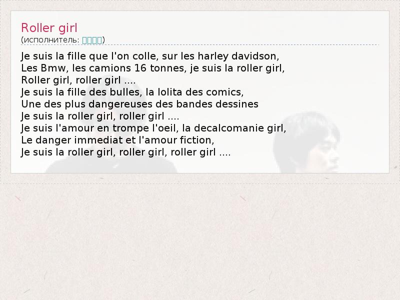 Je suis la fille que l'on colle, sur les harley davidson, Les Bmw, les camions 16 tonnes, je suis la roller girl, Roller girl, roller girl .... Je suis la fille des bulles, la lolita des comics, Une des plus dangereuses des bandes dessines Je suis la roller girl, roller girl .... Je suis l'amour en trompe l'oeil, la decalcomanie girl, Le danger immediat et l'amour fiction, Je suis la roller girl, roller girl, roller girl ....