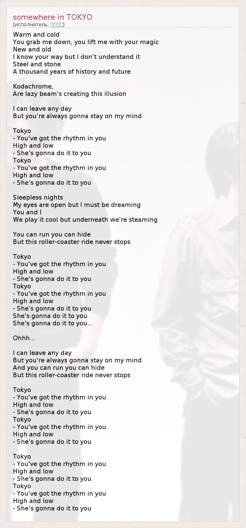 Warm and cold You grab me down, you lift me with your magic New and old I know your way but I don't understand it Steel and stone A thousand years of history and future Kodachrome, Are lazy beam's creating this illusion I can leave any day But you're always gonna stay on my mind Tokyo - You've got the rhythm in you High and low - She's gonna do it to you Tokyo - You've got the rhythm in you High and low - She's gonna do it to you Sleepless nights My eyes are open but I must be dreaming You and I We play it cool but underneath we're steaming You can run you can hide But this roller-coaster ride never stops Tokyo - You've got the rhythm in you High and low - She's gonna do it to you Tokyo - You've got the rhythm in you High and low - She's gonna do it to you She's gonna do it to you She's gonna do it to you... Ohhh... I can leave any day But you're always gonna stay on my mind And you can run you can hide But this roller-coaster ride never stops Tokyo - You've got the rhythm in you High and low - She's gonna do it to you Tokyo - You've got the rhythm in you High and low - She's gonna do it to you Tokyo - You've got the rhythm in you High and low - She's gonna do it to you Tokyo - You've got the rhythm in you High and low - She's gonna do it to you