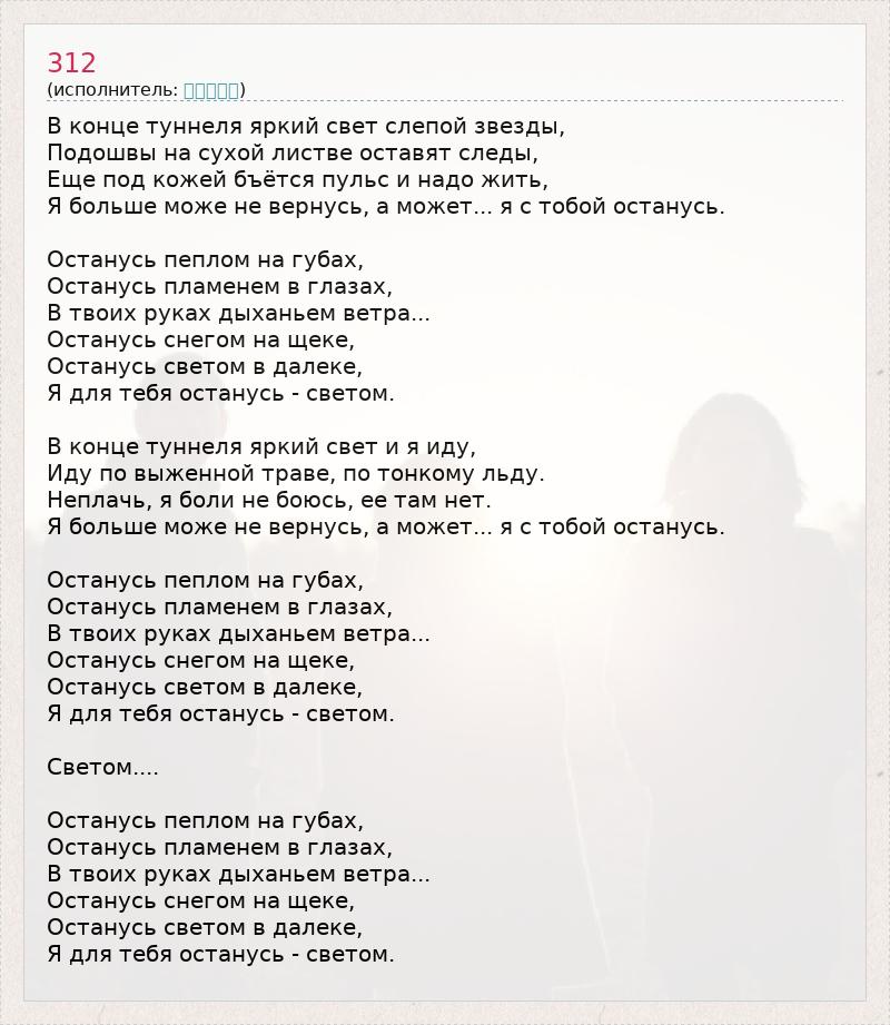 В конце туннеля яркий свет слепой звезды, Подошвы на сухой листве оставят следы, Еще под кожей бъётся пульс и надо жить, Я больше може не вернусь, а может... я с тобой останусь. Останусь пеплом на губах, Останусь пламенем в глазах, В твоих руках дыханьем ветра... Останусь снегом на щеке, Останусь светом в далеке, Я для тебя останусь - светом. В конце туннеля яркий свет и я иду, Иду по выженной траве, по тонкому льду. Неплачь, я боли не боюсь, ее там нет. Я больше може не вернусь, а может... я с тобой останусь. Останусь пеплом на губах, Останусь пламенем в глазах, В твоих руках дыханьем ветра... Останусь снегом на щеке, Останусь светом в далеке, Я для тебя останусь - светом. Светом.... Останусь пеплом на губах, Останусь пламенем в глазах, В твоих руках дыханьем ветра... Останусь снегом на щеке, Останусь светом в далеке, Я для тебя останусь - светом.