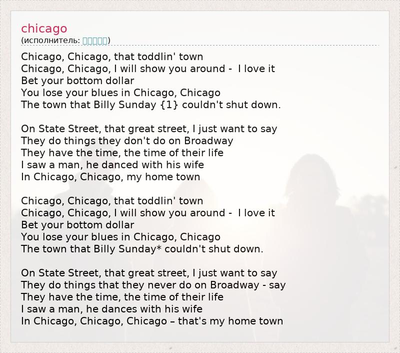 Чикаго, Чикаго, общаг слонял. Охотно б Чикаго я тебе показал - люблю его. Давай поспорим на все, Забудешь про грусть в Чикаго, Чикаго, Билл Сандей* этот город не пронял. На "Стейт-стрит", великой, большой мир людей. Она интересней, чем Бродвей. Сюда ходят жить, а не гулять, Идут со своею женой станцевать, Такой он, Чикаго, город мой. Чикаго, Чикаго, общаг слонял. Охотно б Чикаго я тебе показал - люблю его. Давай поспорим на все, Забудешь про грусть в Чикаго, Чикаго, Билл Сандей* этот город не пронял. На "Стейт-стрит", великой, большой мир людей. Она интересней, чем ваш Бродвей - да, Сюда ходят жить, а не гулять, Идут со своею женой станцевать, В Чикаго, Чикаго, Чикаго - мне родным он стал. * поэтический (эквиритмический) перевод с элементами творческой интерпретации 1 - Билли Сандей. 1862 – 1935. Выдающийся американский спортсмен-регбист, впоследствии известный евангелист, читавший в больших городах США проповеди, в которых ратовал за трезвый образ жизни и сухой закон.