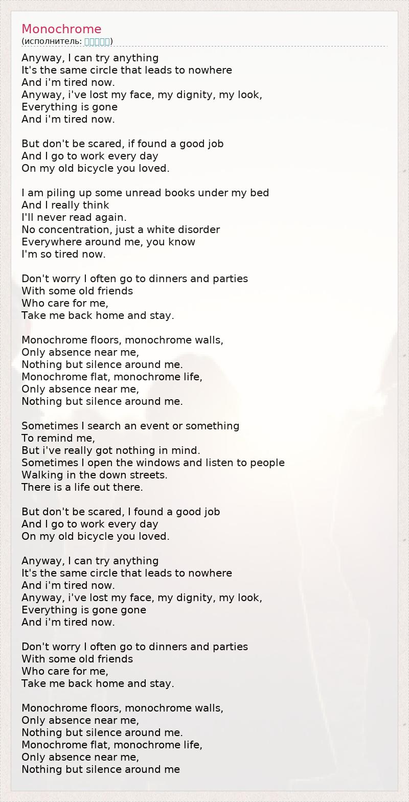 Anyway, I can try anything It's the same circle that leads to nowhere And i'm tired now. Anyway, i've lost my face, my dignity, my look, Everything is gone And i'm tired now. But don't be scared, if found a good job And I go to work every day On my old bicycle you loved. I am piling up some unread books under my bed And I really think I'll never read again. No concentration, just a white disorder Everywhere around me, you know I'm so tired now. Don't worry I often go to dinners and parties With some old friends Who care for me, Take me back home and stay. Monochrome floors, monochrome walls, Only absence near me, Nothing but silence around me. Monochrome flat, monochrome life, Only absence near me, Nothing but silence around me. Sometimes I search an event or something To remind me, But i've really got nothing in mind. Sometimes I open the windows and listen to people Walking in the down streets. There is a life out there. But don't be scared, I found a good job And I go to work every day On my old bicycle you loved. Anyway, I can try anything It's the same circle that leads to nowhere And i'm tired now. Anyway, i've lost my face, my dignity, my look, Everything is gone gone And i'm tired now. Don't worry I often go to dinners and parties With some old friends Who care for me, Take me back home and stay. Monochrome floors, monochrome walls, Only absence near me, Nothing but silence around me. Monochrome flat, monochrome life, Only absence near me, Nothing but silence around me