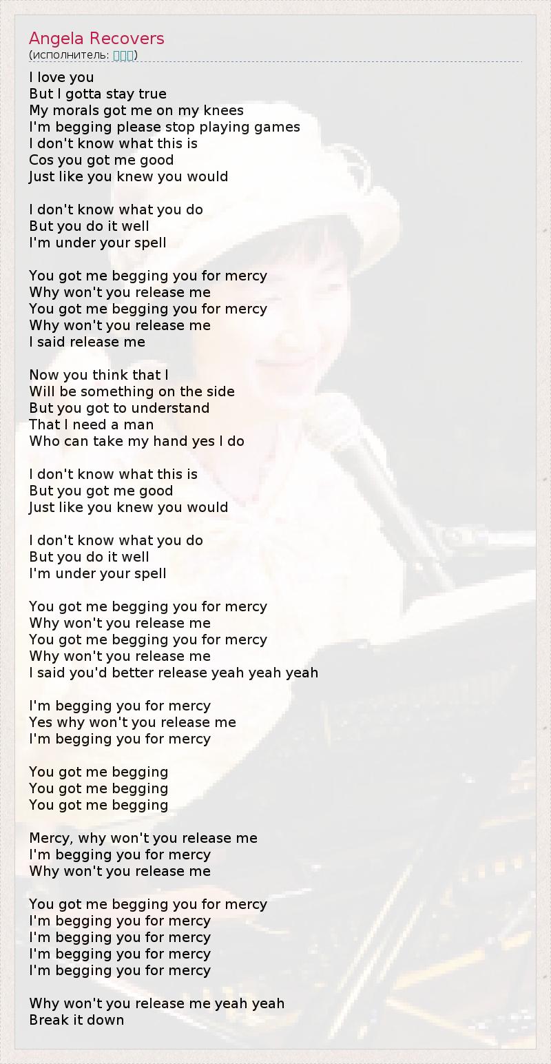 I love you But I gotta stay true My morals got me on my knees I'm begging please stop playing games I don't know what this is Cos you got me good Just like you knew you would I don't know what you do But you do it well I'm under your spell You got me begging you for mercy Why won't you release me You got me begging you for mercy Why won't you release me I said release me Now you think that I Will be something on the side But you got to understand That I need a man Who can take my hand yes I do I don't know what this is But you got me good Just like you knew you would I don't know what you do But you do it well I'm under your spell You got me begging you for mercy Why won't you release me You got me begging you for mercy Why won't you release me I said you'd better release yeah yeah yeah I'm begging you for mercy Yes why won't you release me I'm begging you for mercy You got me begging You got me begging You got me begging Mercy, why won't you release me I'm begging you for mercy Why won't you release me You got me begging you for mercy I'm begging you for mercy I'm begging you for mercy I'm begging you for mercy I'm begging you for mercy Why won't you release me yeah yeah Break it down