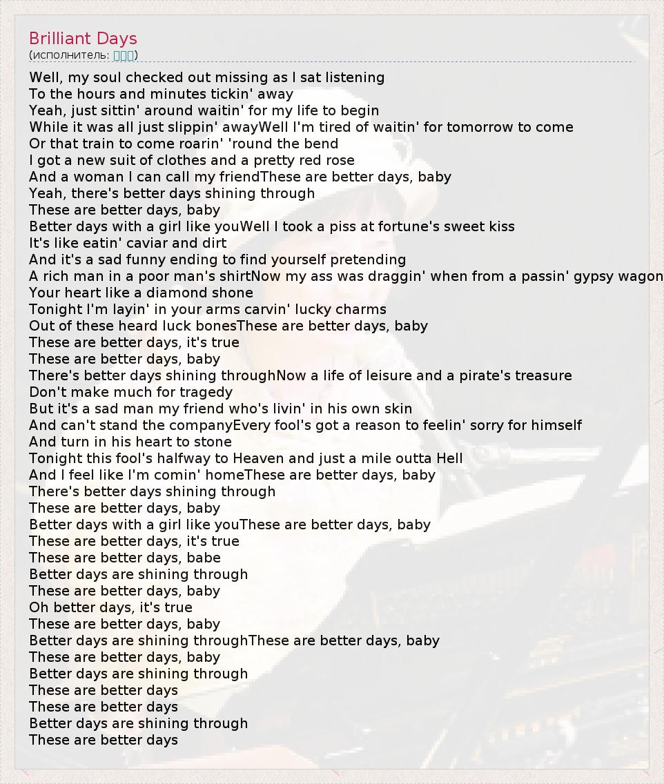 Well, my soul checked out missing as I sat listening To the hours and minutes tickin' away Yeah, just sittin' around waitin' for my life to begin While it was all just slippin' awayWell I'm tired of waitin' for tomorrow to come Or that train to come roarin' 'round the bend I got a new suit of clothes and a pretty red rose And a woman I can call my friendThese are better days, baby Yeah, there's better days shining through These are better days, baby Better days with a girl like youWell I took a piss at fortune's sweet kiss It's like eatin' caviar and dirt And it's a sad funny ending to find yourself pretending A rich man in a poor man's shirtNow my ass was draggin' when from a passin' gypsy wagon Your heart like a diamond shone Tonight I'm layin' in your arms carvin' lucky charms Out of these heard luck bonesThese are better days, baby These are better days, it's true These are better days, baby There's better days shining throughNow a life of leisure and a pirate's treasure Don't make much for tragedy But it's a sad man my friend who's livin' in his own skin And can't stand the companyEvery fool's got a reason to feelin' sorry for himself And turn in his heart to stone Tonight this fool's halfway to Heaven and just a mile outta Hell And I feel like I'm comin' homeThese are better days, baby There's better days shining through These are better days, baby Better days with a girl like youThese are better days, baby These are better days, it's true These are better days, babe Better days are shining through These are better days, baby Oh better days, it's true These are better days, baby Better days are shining throughThese are better days, baby These are better days, baby Better days are shining through These are better days These are better days Better days are shining through These are better days