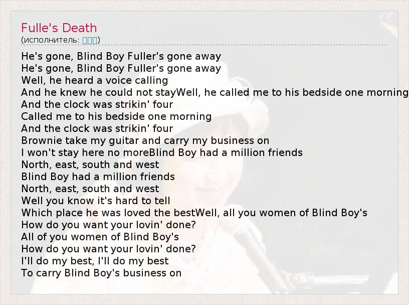 He's gone, Blind Boy Fuller's gone away He's gone, Blind Boy Fuller's gone away Well, he heard a voice calling And he knew he could not stayWell, he called me to his bedside one morning And the clock was strikin' four Called me to his bedside one morning And the clock was strikin' four Brownie take my guitar and carry my business on I won't stay here no moreBlind Boy had a million friends North, east, south and west Blind Boy had a million friends North, east, south and west Well you know it's hard to tell Which place he was loved the bestWell, all you women of Blind Boy's How do you want your lovin' done? All of you women of Blind Boy's How do you want your lovin' done? I'll do my best, I'll do my best To carry Blind Boy's business on