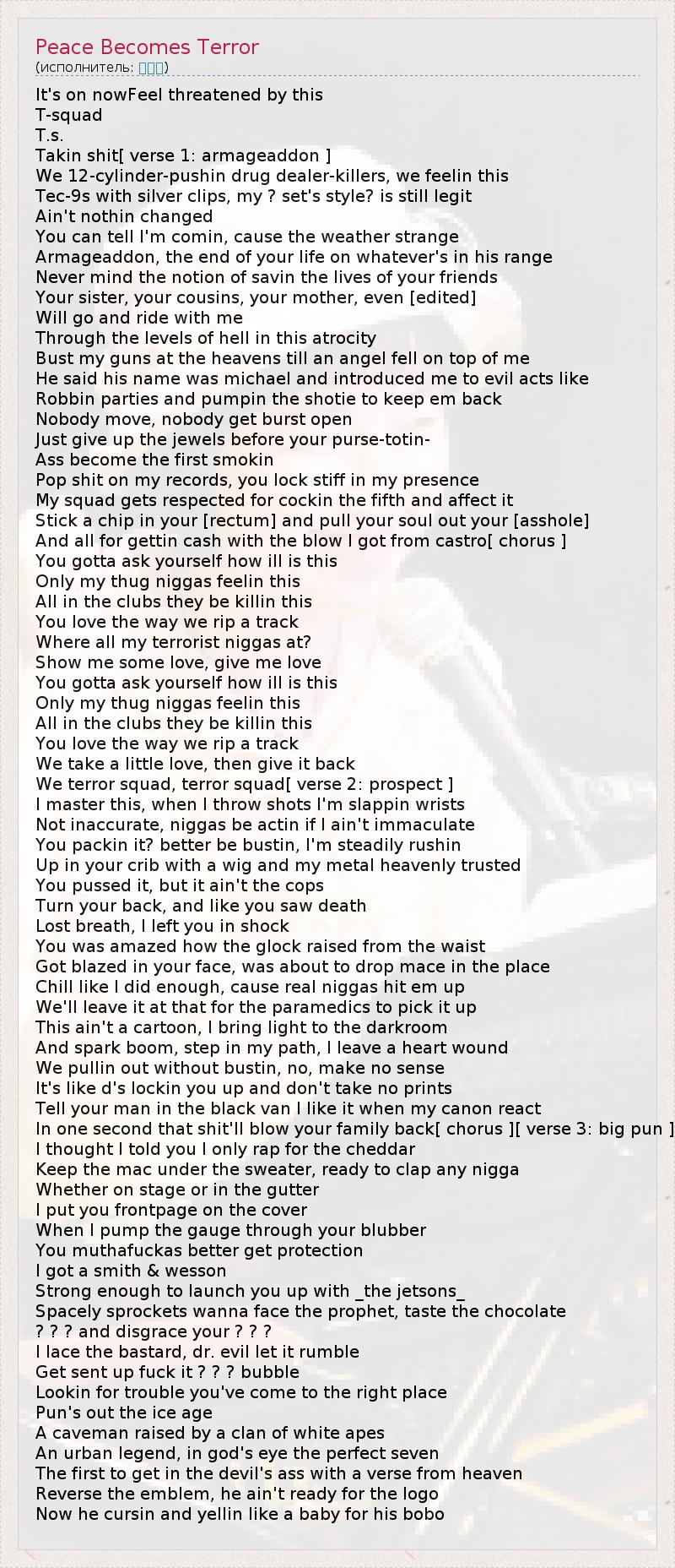 It's on nowFeel threatened by this T-squad T.s. Takin shit[ verse 1: armageaddon ] We 12-cylinder-pushin drug dealer-killers, we feelin this Tec-9s with silver clips, my ? set's style? is still legit Ain't nothin changed You can tell I'm comin, cause the weather strange Armageaddon, the end of your life on whatever's in his range Never mind the notion of savin the lives of your friends Your sister, your cousins, your mother, even [edited] Will go and ride with me Through the levels of hell in this atrocity Bust my guns at the heavens till an angel fell on top of me He said his name was michael and introduced me to evil acts like Robbin parties and pumpin the shotie to keep em back Nobody move, nobody get burst open Just give up the jewels before your purse-totin- Ass become the first smokin Pop shit on my records, you lock stiff in my presence My squad gets respected for cockin the fifth and affect it Stick a chip in your [rectum] and pull your soul out your [asshole] And all for gettin cash with the blow I got from castro[ chorus ] You gotta ask yourself how ill is this Only my thug niggas feelin this All in the clubs they be killin this You love the way we rip a track Where all my terrorist niggas at? Show me some love, give me love You gotta ask yourself how ill is this Only my thug niggas feelin this All in the clubs they be killin this You love the way we rip a track We take a little love, then give it back We terror squad, terror squad[ verse 2: prospect ] I master this, when I throw shots I'm slappin wrists Not inaccurate, niggas be actin if I ain't immaculate You packin it? better be bustin, I'm steadily rushin Up in your crib with a wig and my metal heavenly trusted You pussed it, but it ain't the cops Turn your back, and like you saw death Lost breath, I left you in shock You was amazed how the glock raised from the waist Got blazed in your face, was about to drop mace in the place Chill like I did enough, cause real niggas hit em up We'll leave it at that for the paramedics to pick it up This ain't a cartoon, I bring light to the darkroom And spark boom, step in my path, I leave a heart wound We pullin out without bustin, no, make no sense It's like d's lockin you up and don't take no prints Tell your man in the black van I like it when my canon react In one second that shit'll blow your family back[ chorus ][ verse 3: big pun ] I thought I told you I only rap for the cheddar Keep the mac under the sweater, ready to clap any nigga Whether on stage or in the gutter I put you frontpage on the cover When I pump the gauge through your blubber You muthafuckas better get protection I got a smith & wesson Strong enough to launch you up with _the jetsons_ Spacely sprockets wanna face the prophet, taste the chocolate ? ? ? and disgrace your ? ? ? I lace the bastard, dr. evil let it rumble Get sent up fuck it ? ? ? bubble Lookin for trouble you've come to the right place Pun's out the ice age A caveman raised by a clan of white apes An urban legend, in god's eye the perfect seven The first to get in the devil's ass with a verse from heaven Reverse the emblem, he ain't ready for the logo Now he cursin and yellin like a baby for his bobo