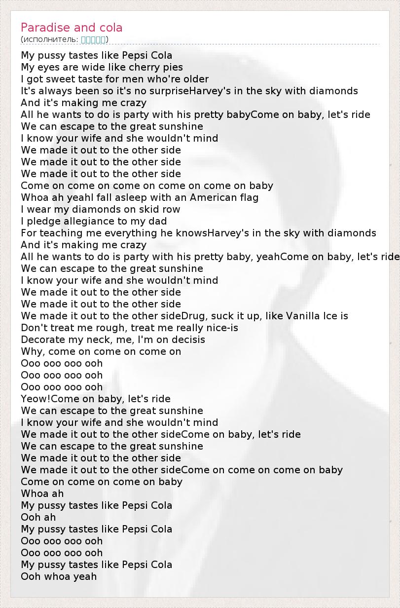My pussy tastes like Pepsi Cola My eyes are wide like cherry pies I got sweet taste for men who're older It's always been so it's no surpriseHarvey's in the sky with diamonds And it's making me crazy All he wants to do is party with his pretty babyCome on baby, let's ride We can escape to the great sunshine I know your wife and she wouldn't mind We made it out to the other side We made it out to the other side We made it out to the other side Come on come on come on come on come on baby Whoa ah yeahI fall asleep with an American flag I wear my diamonds on skid row I pledge allegiance to my dad For teaching me everything he knowsHarvey's in the sky with diamonds And it's making me crazy All he wants to do is party with his pretty baby, yeahCome on baby, let's ride We can escape to the great sunshine I know your wife and she wouldn't mind We made it out to the other side We made it out to the other side We made it out to the other sideDrug, suck it up, like Vanilla Ice is Don't treat me rough, treat me really nice-is Decorate my neck, me, I'm on decisis Why, come on come on come on Ooo ooo ooo ooh Ooo ooo ooo ooh Ooo ooo ooo ooh Yeow!Come on baby, let's ride We can escape to the great sunshine I know your wife and she wouldn't mind We made it out to the other sideCome on baby, let's ride We can escape to the great sunshine We made it out to the other side We made it out to the other sideCome on come on come on baby Come on come on come on baby Whoa ah My pussy tastes like Pepsi Cola Ooh ah My pussy tastes like Pepsi Cola Ooo ooo ooo ooh Ooo ooo ooo ooh My pussy tastes like Pepsi Cola Ooh whoa yeah
