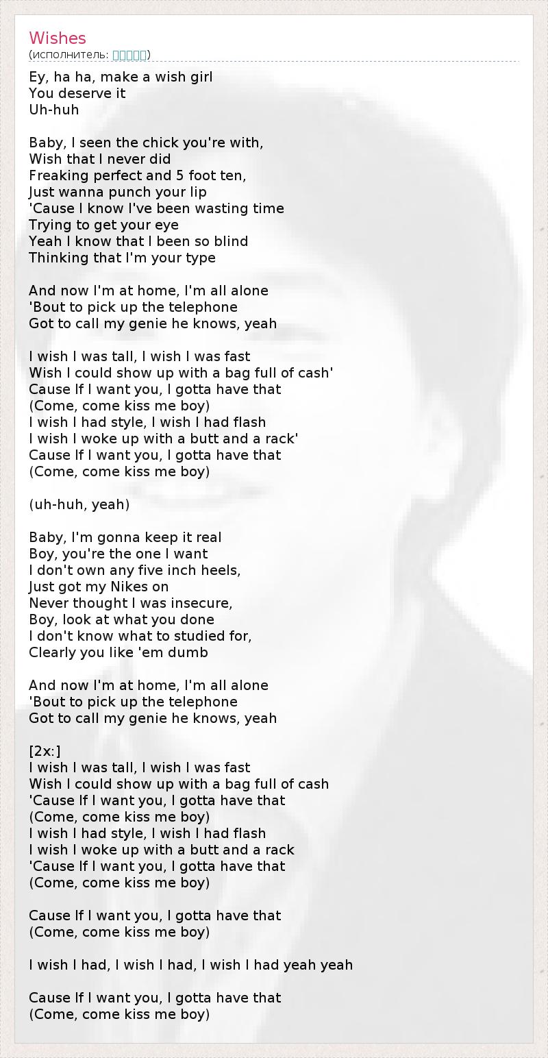 Ey, ha ha, make a wish girl You deserve it Uh-huh Baby, I seen the chick you're with, Wish that I never did Freaking perfect and 5 foot ten, Just wanna punch your lip 'Cause I know I've been wasting time Trying to get your eye Yeah I know that I been so blind Thinking that I'm your type And now I'm at home, I'm all alone 'Bout to pick up the telephone Got to call my genie he knows, yeah I wish I was tall, I wish I was fast Wish I could show up with a bag full of cash' Cause If I want you, I gotta have that (Come, come kiss me boy) I wish I had style, I wish I had flash I wish I woke up with a butt and a rack' Cause If I want you, I gotta have that (Come, come kiss me boy) (uh-huh, yeah) Baby, I'm gonna keep it real Boy, you're the one I want I don't own any five inch heels, Just got my Nikes on Never thought I was insecure, Boy, look at what you done I don't know what to studied for, Clearly you like 'em dumb And now I'm at home, I'm all alone 'Bout to pick up the telephone Got to call my genie he knows, yeah [2x:] I wish I was tall, I wish I was fast Wish I could show up with a bag full of cash 'Cause If I want you, I gotta have that (Come, come kiss me boy) I wish I had style, I wish I had flash I wish I woke up with a butt and a rack 'Cause If I want you, I gotta have that (Come, come kiss me boy) Cause If I want you, I gotta have that (Come, come kiss me boy) I wish I had, I wish I had, I wish I had yeah yeah Cause If I want you, I gotta have that (Come, come kiss me boy)