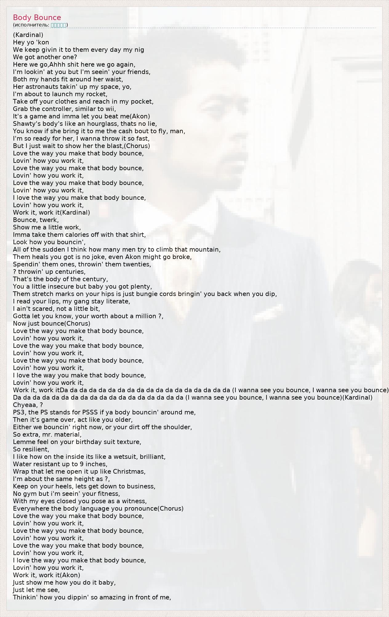 (Kardinal) Hey yo 'kon We keep givin it to them every day my nig We got another one? Here we go,Ahhh shit here we go again, I'm lookin' at you but I'm seein' your friends, Both my hands fit around her waist, Her astronauts takin' up my space, yo, I'm about to launch my rocket, Take off your clothes and reach in my pocket, Grab the controller, similar to wii, It's a game and imma let you beat me(Akon) Shawty's body's like an hourglass, thats no lie, You know if she bring it to me the cash bout to fly, man, I'm so ready for her, I wanna throw it so fast, But I just wait to show her the blast,(Chorus) Love the way you make that body bounce, Lovin' how you work it, Love the way you make that body bounce, Lovin' how you work it, Love the way you make that body bounce, Lovin' how you work it, I love the way you make that body bounce, Lovin' how you work it, Work it, work it(Kardinal) Bounce, twerk, Show me a little work, Imma take them calories off with that shirt, Look how you bouncin', All of the sudden I think how many men try to climb that mountain, Them heals you got is no joke, even Akon might go broke, Spendin' them ones, throwin' them twenties, ? throwin' up centuries, That's the body of the century, You a little insecure but baby you got plenty, Them stretch marks on your hips is just bungie cords bringin' you back when you dip, I read your lips, my gang stay literate, I ain't scared, not a little bit, Gotta let you know, your worth about a million ?, Now just bounce(Chorus) Love the way you make that body bounce, Lovin' how you work it, Love the way you make that body bounce, Lovin' how you work it, Love the way you make that body bounce, Lovin' how you work it, I love the way you make that body bounce, Lovin' how you work it, Work it, work itDa da da da da da da da da da da da da da da da da da (I wanna see you bounce, I wanna see you bounce) Da da da da da da da da da da da da da da da da da da (I wanna see you bounce, I wanna see you bounce)(Kardinal) Chyeaa, ? PS3, the PS stands for PSSS if ya body bouncin' around me, Then it's game over, act like you older, Either we bouncin' right now, or your dirt off the shoulder, So extra, mr. material, Lemme feel on your birthday suit texture, So resilient, I like how on the inside its like a wetsuit, brilliant, Water resistant up to 9 inches, Wrap that let me open it up like Christmas, I'm about the same height as ?, Keep on your heels, lets get down to business, No gym but i'm seein' your fitness, With my eyes closed you pose as a witness, Everywhere the body language you pronounce(Chorus) Love the way you make that body bounce, Lovin' how you work it, Love the way you make that body bounce, Lovin' how you work it, Love the way you make that body bounce, Lovin' how you work it, I love the way you make that body bounce, Lovin' how you work it, Work it, work it(Akon) Just show me how you do it baby, Just let me see, Thinkin' how you dippin' so amazing in front of me,