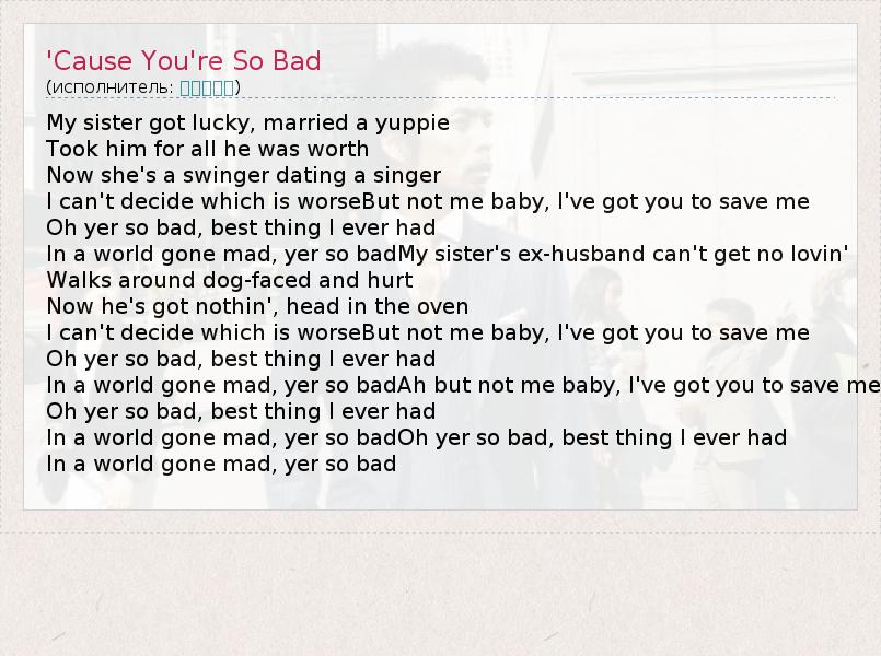 My sister got lucky, married a yuppie Took him for all he was worth Now she's a swinger dating a singer I can't decide which is worseBut not me baby, I've got you to save me Oh yer so bad, best thing I ever had In a world gone mad, yer so badMy sister's ex-husband can't get no lovin' Walks around dog-faced and hurt Now he's got nothin', head in the oven I can't decide which is worseBut not me baby, I've got you to save me Oh yer so bad, best thing I ever had In a world gone mad, yer so badAh but not me baby, I've got you to save me Oh yer so bad, best thing I ever had In a world gone mad, yer so badOh yer so bad, best thing I ever had In a world gone mad, yer so bad