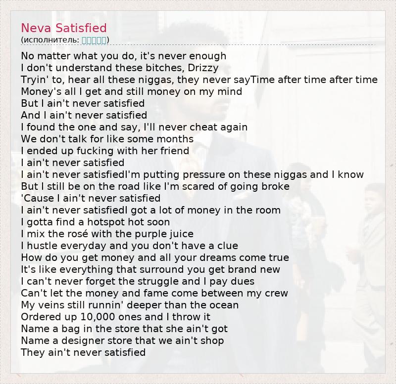 No matter what you do, it's never enough I don't understand these bitches, Drizzy Tryin' to, hear all these niggas, they never sayTime after time after time Money's all I get and still money on my mind But I ain't never satisfied And I ain't never satisfied I found the one and say, I'll never cheat again We don't talk for like some months I ended up fucking with her friend I ain't never satisfied I ain't never satisfiedI'm putting pressure on these niggas and I know But I still be on the road like I'm scared of going broke 'Cause I ain't never satisfied I ain't never satisfiedI got a lot of money in the room I gotta find a hotspot hot soon I mix the rosé with the purple juice I hustle everyday and you don't have a clue How do you get money and all your dreams come true It's like everything that surround you get brand new I can't never forget the struggle and I pay dues Can't let the money and fame come between my crew My veins still runnin' deeper than the ocean Ordered up 10,000 ones and I throw it Name a bag in the store that she ain't got Name a designer store that we ain't shop They ain't never satisfied