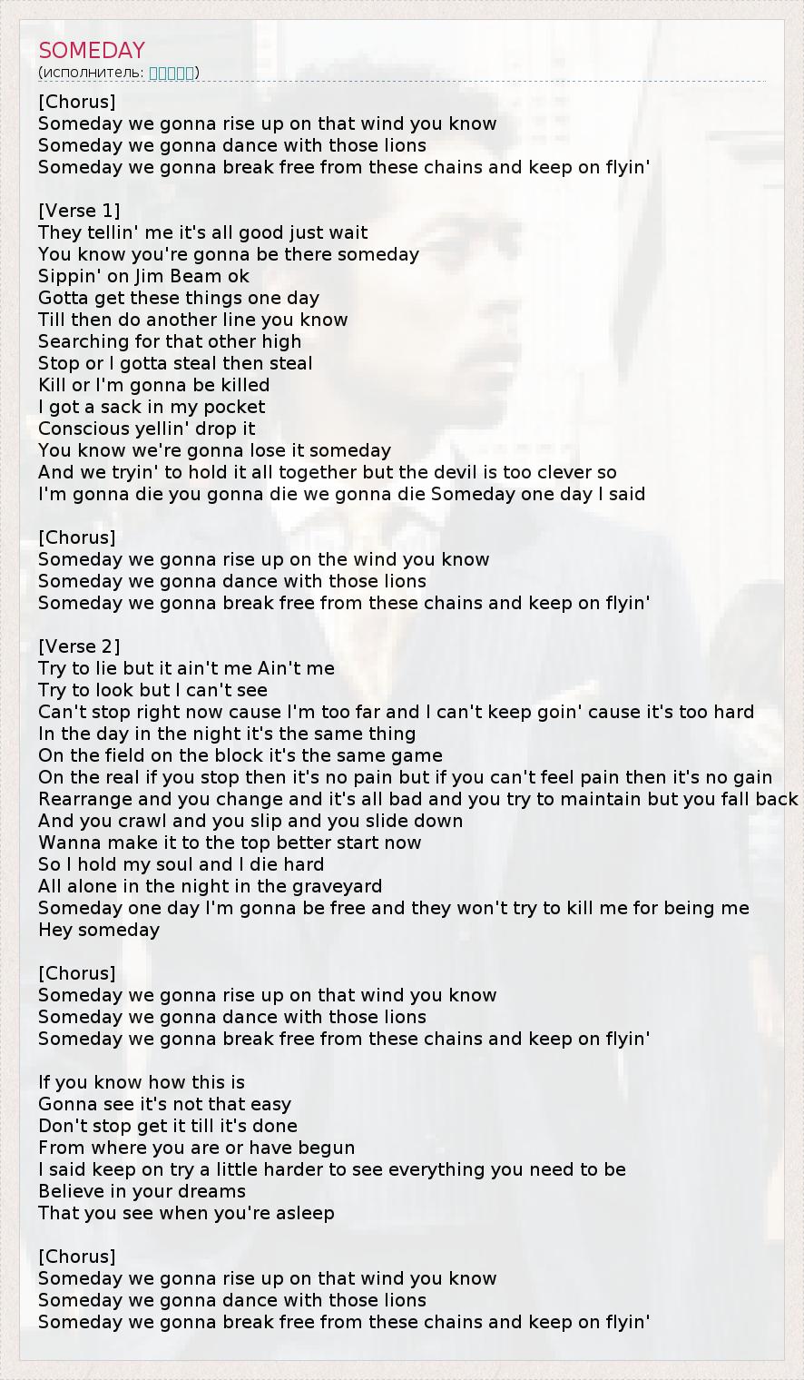 Однажды мы вознесёмся вместе с этим ветром, Однажды мы будем танцевать со львами, Однажды мы избавимся от этих цепей и продолжим полёт! Мне говорят, что жить ожиданием – это нормально, Знаешь, однажды ты попадёшь туда, Будешь потягивать «Джим Бим», да, Однажды у тебя будет всё это. А до тех пор гни свою линию, Ищи чего-то другого, что тоже тебя привлекает, Прекрати или я украду, а потом и ещё раз, Убей, или убьют меня. У меня в кармане пакет, Совесть кричит, выбрось её. Ты знаешь, что сегодня мы её потеряем. Мы пытаемся держать всё вместе, но дьявол так же умён, Я умру, ты умрёшь, умрём мы все Однажды, рано или поздно, слушайте меня. Однажды мы вознесёмся вместе с этим ветром, Однажды мы будем танцевать со львами, Однажды мы избавимся от этих цепей и продолжим полёт! Пытаюсь лгать, но это не я, не я, Пытаюсь смотреть, но я не вижу. Уже не могу остановиться, потому что зашёл слишком далеко, и не могу идти дальше, потому что это слишком трудно. Днём, ночью, всё одно и то же, И на поле, и дома одна и та же игра. На самом деле, если ты остановишься, боль пройдёт, но без боли нет и достижений. Перестройся, изменись, всё ужасно, ты пытаешься удержаться, но ты отступаешь. Ты ползёшь, проскальзываешь, всё ниже… Хочешь подняться на вершину? Начни сейчас. И я поддерживаю душу и умираю в муках, Один ночью на кладбище. Когда-нибудь, однажды я освобожусь, и они Оставят попытки убить меня, чтоб занять моё место, Эй, однажды… Однажды мы вознесёмся вместе с этим ветром, Однажды мы будем танцевать со львами, Однажды мы избавимся от этих цепей и продолжим полёт! Если ты знаешь что-нибудь об этом, Ты увидишь, что это далеко не просто. Не останавливайся, доведи дело до конца С того места, откуда ты начинаешь или начал. Послушай, прилагай чуть больше усилий, чтобы увидеть, кем тебе нужно стать. Поверь в свои сны, Которые ты видишь, когда спишь. Однажды мы вознесёмся вместе с этим ветром, Однажды мы будем танцевать со львами, Однажды мы избавимся от этих цепей и продолжим полёт!