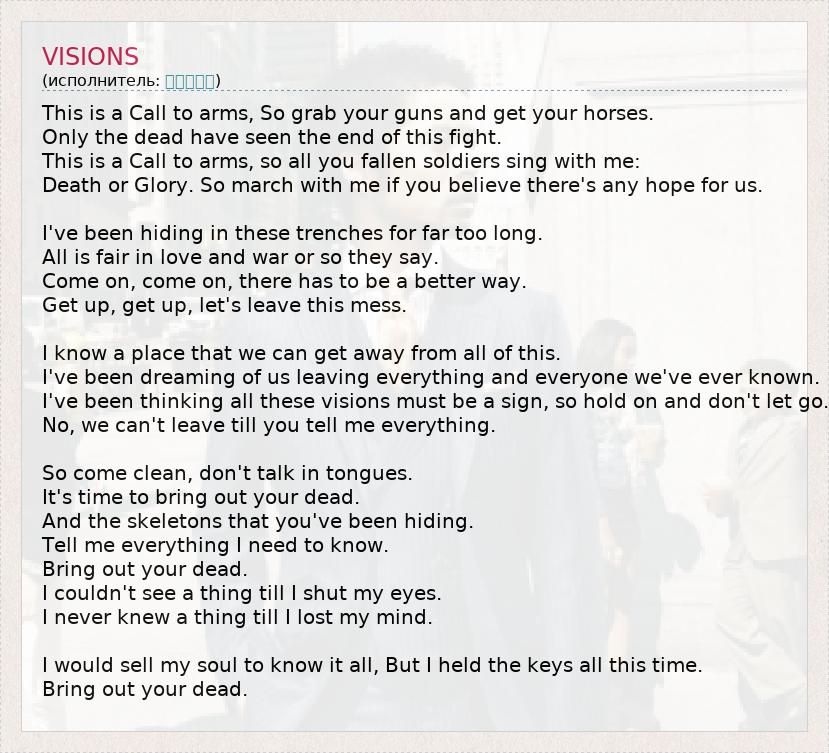 Это призыв к оружию, так берите оружие и получить лошадей. Только мертвые видели конец этой борьбе. Это призыв к оружию, так что все, что вам павших солдат петь со мной: Смерть или слава. Так марш со мной, если вы считаете, есть ли надежда на нас. Я скрывался в этих окопах слишком долго. Все есть в любви и на войне, так они говорят. Давай, давай, там должен быть лучший способ. Вставай, вставай, оставим этот беспорядок. Я знаю одно место, что мы можем уйти от всего этого. Я мечтал из нас оставить все и все мы когда-либо знал. Я думал все эти видения должен быть знаком, так что держаться и не отпускать. Нет, мы не можем оставить, пока вы мне все расскажет. Так что приезжайте чистые, не говорят на языках. Пришло время выявить ваши мертвы. И скелеты, что вы были скрываться. Скажи мне все, что нужно знать. Выведите ваших мертвых. Я не мог видеть вещи, пока я не закрыл глаза. Я никогда не знал вещь, пока я не сошел с ума. Я продал бы душу мою знать все это, но я держал ключи все это время. Выведите ваших мертвых.
