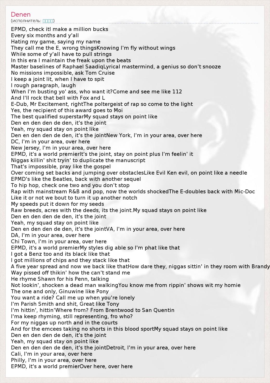 EPMD, check itI make a million bucks Every six months and y'all Hating my game, saying my name They call me the E, wrong thingsKnowing I'm fly without wings While some of y'all have to pull strings In this era I maintain the freak upon the beats Master baselines of Raphael SaadiqLyrical mastermind, a genius so don't snooze No missions impossible, ask Tom Cruise I keep a joint lit, when I have to spit I rough paragraph, laugh When I'm busting yo' ass, who want it?Come and see me like 112 And I'll rock that bell with Fox and L E-Dub, Mr Excitement, rightThe poltergeist of rap so come to the light Yes, the recipient of this award goes to Moi The best qualified superstarMy squad stays on point like Den en den den de den, it's the joint Yeah, my squad stay on point like Den en den den de den, it's the jointNew York, I'm in your area, over here DC, I'm in your area, over here New Jersey, I'm in your area, over here EPMD, it's a world premierIt's the joint, stay on point plus I'm feelin' it Niggas killin' shit tryin' to duplicate the manuscript That's impossible, pray like the gospel Over coming set backs and jumping over obstaclesLike Evil Ken evil, on point like a needle EPMD's like the Beatles, back with another sequel To hip hop, check one two and you don't stop Rap with mainstream R&B and pop, now the worlds shockedThe E-doubles back with Mic-Doc Like it or not we bout to turn it up another notch My speeds put it down for my seeds Raw breeds, acres with the deeds, its the joint.My squad stays on point like Den en den den de den, it's the joint Yeah, my squad stay on point like Den en den den de den, it's the jointVA, I'm in your area, over here DA, I'm in your area, over here Chi Town, I'm in your area, over here EPMD, it's a world premierMy styles dig able so I'm phat like that I got a Benz too and its black like that I got millions of chips and they stack like that A five year spread and now we back like thatHow dare they, niggas sittin' in they room with Brandy Way pissed off thikin' how the can't stand me He rhyme Shawn for his Penn, talking Not lookin', shocken a dead man walkingYou know me from rippin' shows wit my homie The one and only, Ginuwine like Pony You want a ride? Call me up when you're lonely I'm Parish Smith and shit, Great like Tony I'm hittin', hittin'Where from? From Brentwood to San Quentin I'ma keep rhyming, still representing, fro who? For my niggas up north and in the courts And for the emcees taking no shorts in this blood sportMy squad stays on point like Den en den den de den, it's the joint Yeah, my squad stay on point like Den en den den de den, it's the jointDetroit, I'm in your area, over here Cali, I'm in your area, over here Philly, I'm in your area, over here EPMD, it's a world premierOver here, over here