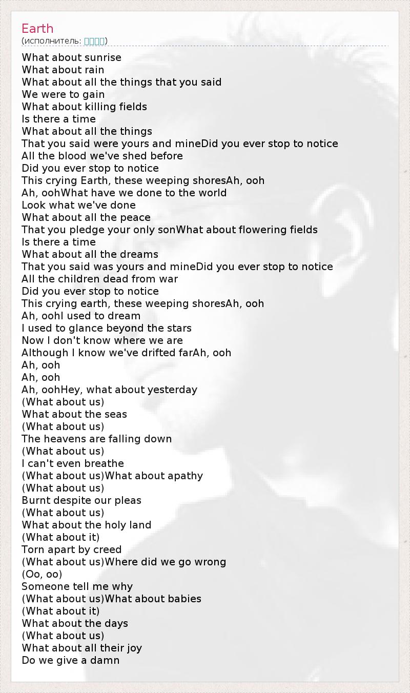 What about sunrise What about rain What about all the things that you said We were to gain What about killing fields Is there a time What about all the things That you said were yours and mineDid you ever stop to notice All the blood we've shed before Did you ever stop to notice This crying Earth, these weeping shoresAh, ooh Ah, oohWhat have we done to the world Look what we've done What about all the peace That you pledge your only sonWhat about flowering fields Is there a time What about all the dreams That you said was yours and mineDid you ever stop to notice All the children dead from war Did you ever stop to notice This crying earth, these weeping shoresAh, ooh Ah, oohI used to dream I used to glance beyond the stars Now I don't know where we are Although I know we've drifted farAh, ooh Ah, ooh Ah, ooh Ah, oohHey, what about yesterday (What about us) What about the seas (What about us) The heavens are falling down (What about us) I can't even breathe (What about us)What about apathy (What about us) Burnt despite our pleas (What about us) What about the holy land (What about it) Torn apart by creed (What about us)Where did we go wrong (Oo, oo) Someone tell me why (What about us)What about babies (What about it) What about the days (What about us) What about all their joy Do we give a damn