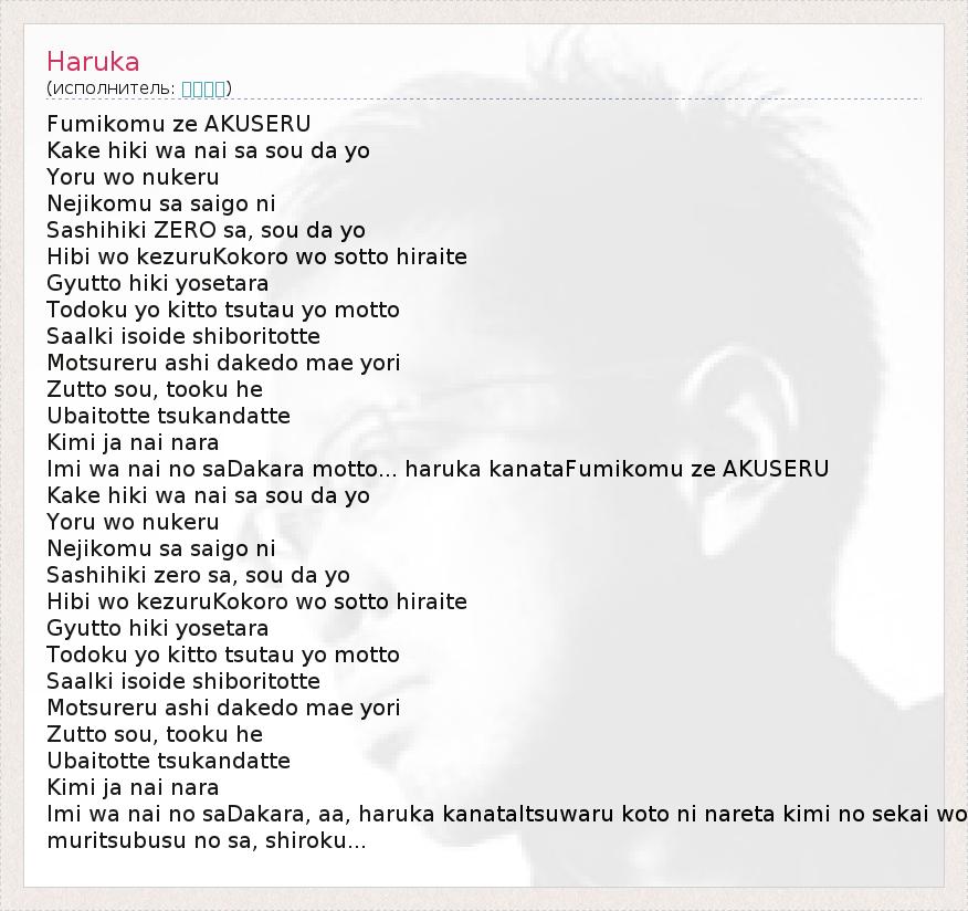 Fumikomu ze AKUSERU Kake hiki wa nai sa sou da yo Yoru wo nukeru Nejikomu sa saigo ni Sashihiki ZERO sa, sou da yo Hibi wo kezuruKokoro wo sotto hiraite Gyutto hiki yosetara Todoku yo kitto tsutau yo motto SaaIki isoide shiboritotte Motsureru ashi dakedo mae yori Zutto sou, tooku he Ubaitotte tsukandatte Kimi ja nai nara Imi wa nai no saDakara motto... haruka kanataFumikomu ze AKUSERU Kake hiki wa nai sa sou da yo Yoru wo nukeru Nejikomu sa saigo ni Sashihiki zero sa, sou da yo Hibi wo kezuruKokoro wo sotto hiraite Gyutto hiki yosetara Todoku yo kitto tsutau yo motto SaaIki isoide shiboritotte Motsureru ashi dakedo mae yori Zutto sou, tooku he Ubaitotte tsukandatte Kimi ja nai nara Imi wa nai no saDakara, aa, haruka kanataItsuwaru koto ni nareta kimi no sekai wo muritsubusu no sa, shiroku...