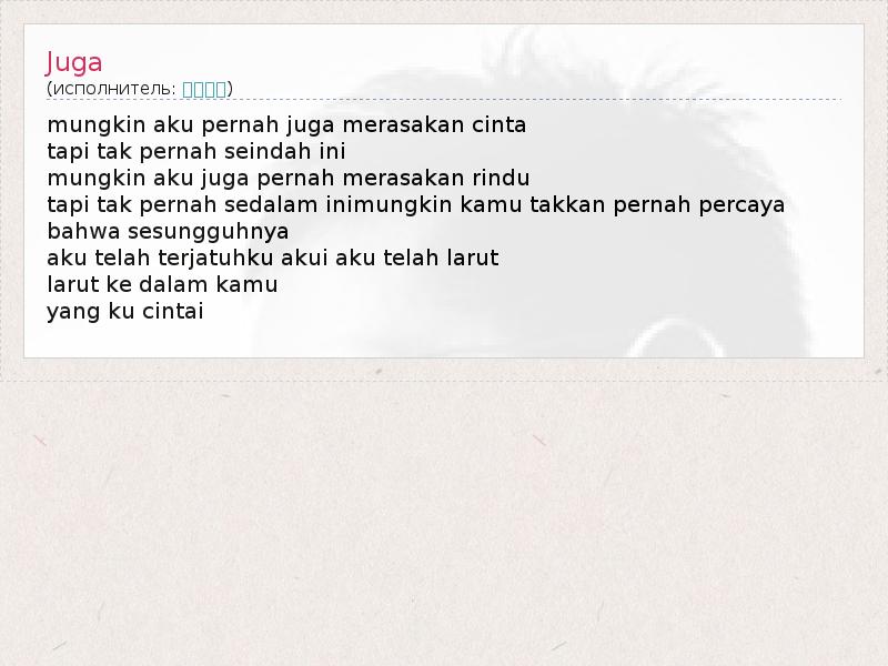 mungkin aku pernah juga merasakan cinta tapi tak pernah seindah ini mungkin aku juga pernah merasakan rindu tapi tak pernah sedalam inimungkin kamu takkan pernah percaya bahwa sesungguhnya aku telah terjatuhku akui aku telah larut larut ke dalam kamu yang ku cintai