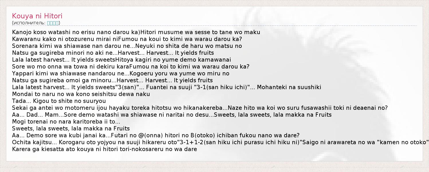 Kanojo koso watashi no erisu nano darou ka)Hitori musume wa sesse to tane wo maku Kawaranu kako ni otozurenu mirai niFumou na koui to kimi wa warau darou ka? Sorenara kimi wa shiawase nan darou ne...Neyuki no shita de haru wo matsu no Natsu ga sugireba minori no aki ne...Harvest... Harvest... It yields fruits Lala latest harvest... It yields sweetsHitoya kagiri no yume demo kamawanai Sore wo mo onna wa towa ni dekiru karaFumou na koi to kimi wa warau darou ka? Yappari kimi wa shiawase nandarou ne...Kogoeru yoru wa yume wo miru no Natsu ga sugireba omoi ga minoru...Harvest... Harvest... It yields fruits Lala latest harvest... It yields sweets"3(san)"... Fuantei na suuji "3-1(san hiku ichi)"... Mohanteki na suushiki Mondai to naru no wa kono seishitsu dewa naku Tada... Kigou to shite no suuryou Sekai ga antei wo motomeru ijou hayaku toreka hitotsu wo hikanakereba...Naze hito wa koi wo suru fusawashii toki ni deaenai no? Aa... Dad... Mam...Sore demo watashi wa shiawase ni naritai no desu...Sweets, lala sweets, lala makka na Fruits Mogi torenai no nara karitoreba ii to... Sweets, lala sweets, lala makka na Fruits Aa... Demo sore wa kubi janai ka...Futari no @(onna) hitori no B(otoko) ichiban fukou nano wa dare? Ochita kajitsu... Korogaru oto yojyou na suuji hikareru oto"3-1+1-2(san hiku ichi purasu ichi hiku ni)"Saigo ni arawareta no wa "kamen no otoko" Karera ga kiesatta ato kouya ni hitori tori-nokosareru no wa dare