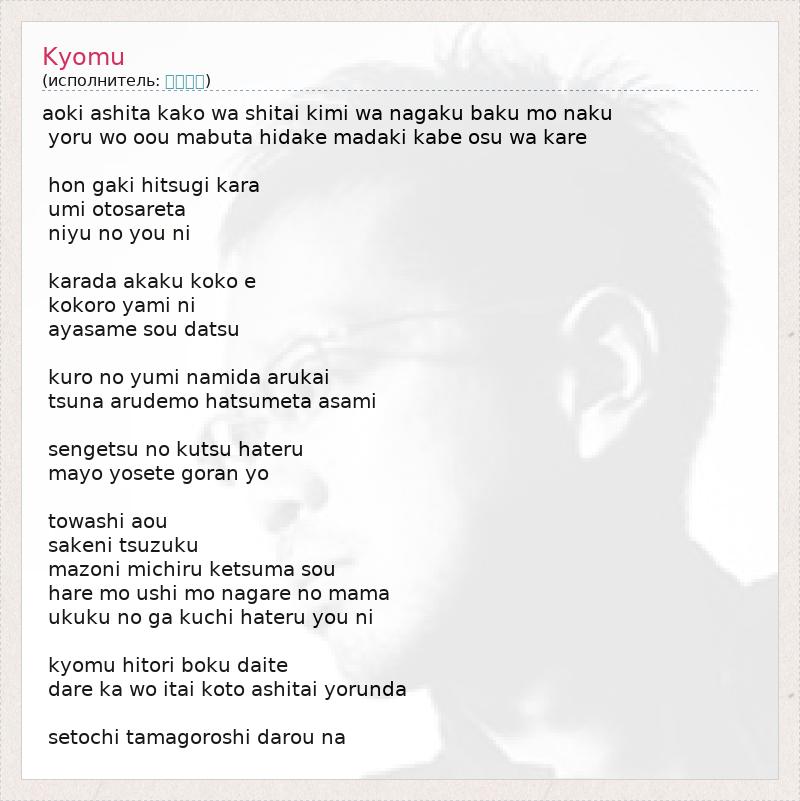 aoki ashita kako wa shitai kimi wa nagaku baku mo naku yoru wo oou mabuta hidake madaki kabe osu wa kare hon gaki hitsugi kara umi otosareta niyu no you ni karada akaku koko e kokoro yami ni ayasame sou datsu kuro no yumi namida arukai tsuna arudemo hatsumeta asami sengetsu no kutsu hateru mayo yosete goran yo towashi aou sakeni tsuzuku mazoni michiru ketsuma sou hare mo ushi mo nagare no mama ukuku no ga kuchi hateru you ni kyomu hitori boku daite dare ka wo itai koto ashitai yorunda setochi tamagoroshi darou na