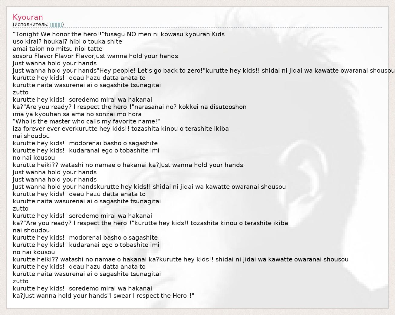 "Tonight We honor the hero!!"fusagu NO men ni kowasu kyouran Kids uso kirai? houkai? hibi o touka shite amai taion no mitsu nioi tatte sosoru Flavor Flavor FlavorJust wanna hold your hands Just wanna hold your hands Just wanna hold your hands"Hey people! Let's go back to zero!"kurutte hey kids!! shidai ni jidai wa kawatte owaranai shousou kurutte hey kids!! deau hazu datta anata to kurutte naita wasurenai ai o sagashite tsunagitai zutto kurutte hey kids!! soredemo mirai wa hakanai ka?"Are you ready? I respect the hero!!"narasanai no? kokkei na disutooshon ima ya kyouhan sa ama no sonzai mo hora "Who is the master who calls my favorite name!" iza forever ever everkurutte hey kids!! tozashita kinou o terashite ikiba nai shoudou kurutte hey kids!! modorenai basho o sagashite kurutte hey kids!! kudaranai ego o tobashite imi no nai kousou kurutte heiki?? watashi no namae o hakanai ka?Just wanna hold your hands Just wanna hold your hands Just wanna hold your hands Just wanna hold your handskurutte hey kids!! shidai ni jidai wa kawatte owaranai shousou kurutte hey kids!! deau hazu datta anata to kurutte naita wasurenai ai o sagashite tsunagitai zutto kurutte hey kids!! soredemo mirai wa hakanai ka?"Are you ready? I respect the hero!!"kurutte hey kids!! tozashita kinou o terashite ikiba nai shoudou kurutte hey kids!! modorenai basho o sagashite kurutte hey kids!! kudaranai ego o tobashite imi no nai kousou kurutte heiki?? watashi no namae o hakanai ka?kurutte hey kids!! shidai ni jidai wa kawatte owaranai shousou kurutte hey kids!! deau hazu datta anata to kurutte naita wasurenai ai o sagashite tsunagitai zutto kurutte hey kids!! soredemo mirai wa hakanai ka?Just wanna hold your hands"I swear I respect the Hero!!"