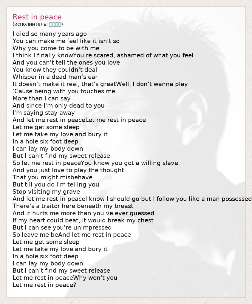 I died so many years ago You can make me feel like it isn't so Why you come to be with me I think I finally knowYou're scared, ashamed of what you feel And you can't tell the ones you love You know they couldn't deal Whisper in a dead man's ear It doesn't make it real, that's greatWell, I don't wanna play 'Cause being with you touches me More than I can say And since I'm only dead to you I'm saying stay away And let me rest in peaceLet me rest in peace Let me get some sleep Let me take my love and bury it In a hole six foot deep I can lay my body down But I can't find my sweet release So let me rest in peaceYou know you got a willing slave And you just love to play the thought That you might misbehave But till you do I'm telling you Stop visiting my grave And let me rest in peaceI know I should go but I follow you like a man possessed There's a traitor here beneath my breast And it hurts me more than you've ever guessed If my heart could beat, it would break my chest But I can see you're unimpressed So leave me beAnd let me rest in peace Let me get some sleep Let me take my love and bury it In a hole six foot deep I can lay my body down But I can't find my sweet release Let me rest in peaceWhy won't you Let me rest in peace?