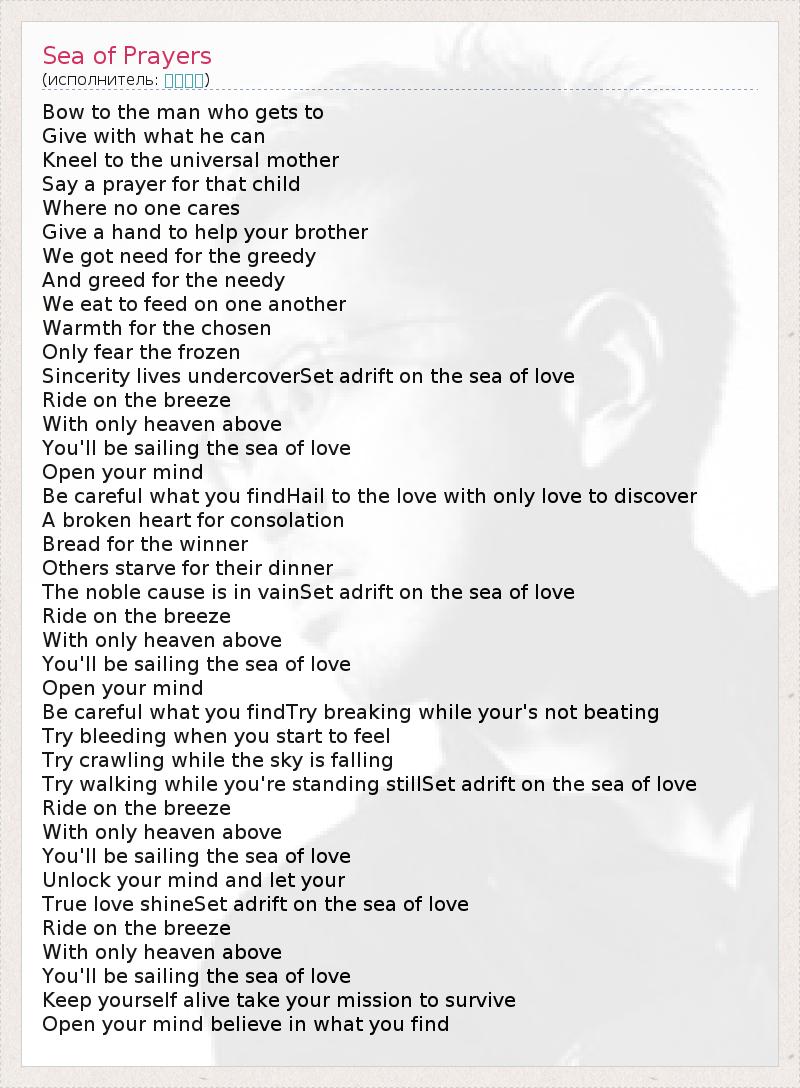 Bow to the man who gets to Give with what he can Kneel to the universal mother Say a prayer for that child Where no one cares Give a hand to help your brother We got need for the greedy And greed for the needy We eat to feed on one another Warmth for the chosen Only fear the frozen Sincerity lives undercoverSet adrift on the sea of love Ride on the breeze With only heaven above You'll be sailing the sea of love Open your mind Be careful what you findHail to the love with only love to discover A broken heart for consolation Bread for the winner Others starve for their dinner The noble cause is in vainSet adrift on the sea of love Ride on the breeze With only heaven above You'll be sailing the sea of love Open your mind Be careful what you findTry breaking while your's not beating Try bleeding when you start to feel Try crawling while the sky is falling Try walking while you're standing stillSet adrift on the sea of love Ride on the breeze With only heaven above You'll be sailing the sea of love Unlock your mind and let your True love shineSet adrift on the sea of love Ride on the breeze With only heaven above You'll be sailing the sea of love Keep yourself alive take your mission to survive Open your mind believe in what you find