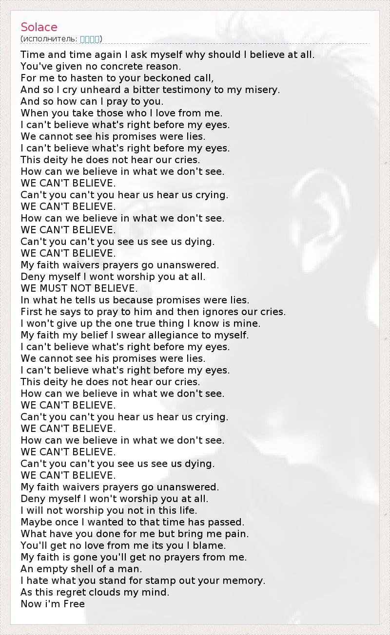 Time and time again I ask myself why should I believe at all. You've given no concrete reason. For me to hasten to your beckoned call, And so I cry unheard a bitter testimony to my misery. And so how can I pray to you. When you take those who I love from me. I can't believe what's right before my eyes. We cannot see his promises were lies. I can't believe what's right before my eyes. This deity he does not hear our cries. How can we believe in what we don't see. WE CAN'T BELIEVE. Can't you can't you hear us hear us crying. WE CAN'T BELIEVE. How can we believe in what we don't see. WE CAN'T BELIEVE. Can't you can't you see us see us dying. WE CAN'T BELIEVE. My faith waivers prayers go unanswered. Deny myself I wont worship you at all. WE MUST NOT BELIEVE. In what he tells us because promises were lies. First he says to pray to him and then ignores our cries. I won't give up the one true thing I know is mine. My faith my belief I swear allegiance to myself. I can't believe what's right before my eyes. We cannot see his promises were lies. I can't believe what's right before my eyes. This deity he does not hear our cries. How can we believe in what we don't see. WE CAN'T BELIEVE. Can't you can't you hear us hear us crying. WE CAN'T BELIEVE. How can we believe in what we don't see. WE CAN'T BELIEVE. Can't you can't you see us see us dying. WE CAN'T BELIEVE. My faith waivers prayers go unanswered. Deny myself I won't worship you at all. I will not worship you not in this life. Maybe once I wanted to that time has passed. What have you done for me but bring me pain. You'll get no love from me its you I blame. My faith is gone you'll get no prayers from me. An empty shell of a man. I hate what you stand for stamp out your memory. As this regret clouds my mind. Now i'm Free