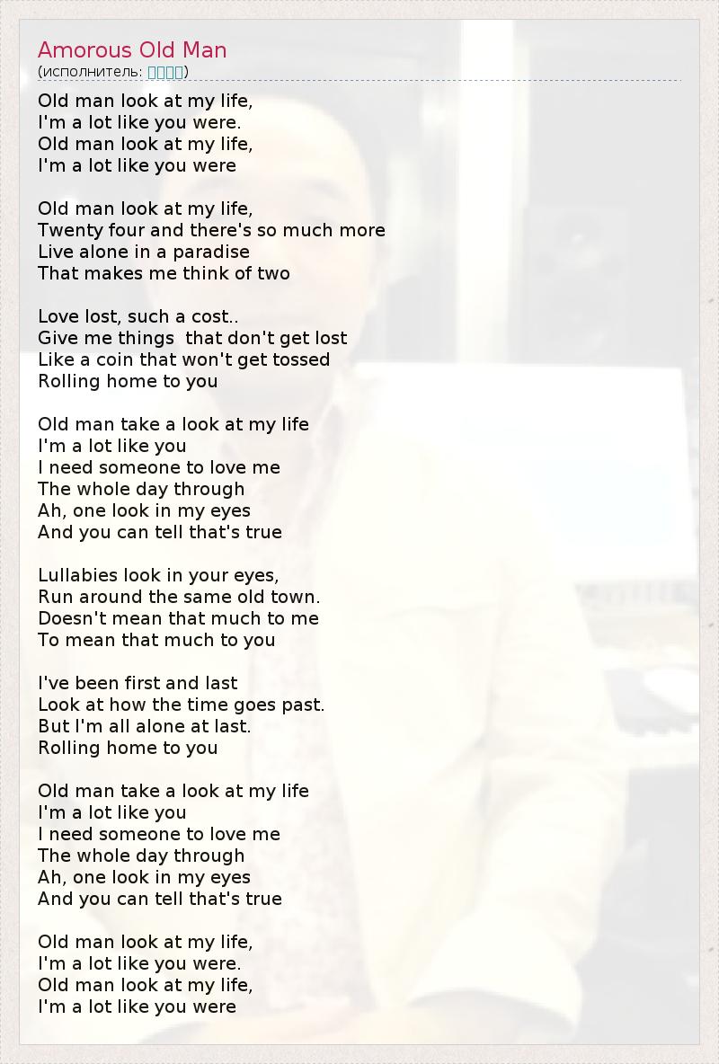 Старик, взгляни на мою жизнь, Во многом я такой же, каким был ты, Старик, взгляни на мою жизнь, Во многом я такой же, каким был ты Старик, взгляни на мою жизнь, Мне 24, и столько всего еще впереди, А я живу один в раю, что заставляет Меня думать о том, каково быть вдвоем Потерянная любовь, такая вот цена.. Дай же мне что-то, что нельзя потерять, Словно монетку, которую как бы ни подкинули, А она катится назад к тебе Старик, взгляни на мою жизнь, Во многом я такой же, как и ты, Мне нужен кто-то, кто любил бы меня На протяжении всего дня, Ах, лишь взгляни в мои глаза И ты поймешь, что это правда В твоих глазах убаюкивающие песни, Все тот же старый городок, И мне не особо и важно, Значу ли я что-нибудь для тебя Я был и первым, и последним, Взгляни, как проходит время, В конце концов я остался совсем один, Я возвращаюсь домой, к тебе Старик, взгляни на мою жизнь, Во многом я такой же, как и ты, Мне нужен кто-то, кто любил бы меня На протяжении всего дня, Ах, лишь взгляни в мои глаза И ты поймешь, что это правда Старик, взгляни на мою жизнь, Во многом я такой же, каким был ты, Старик, взгляни на мою жизнь, Во многом я такой же, каким был ты