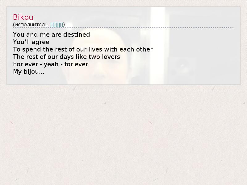 You and me are destined You'll agree To spend the rest of our lives with each other The rest of our days like two lovers For ever - yeah - for ever My bijou...