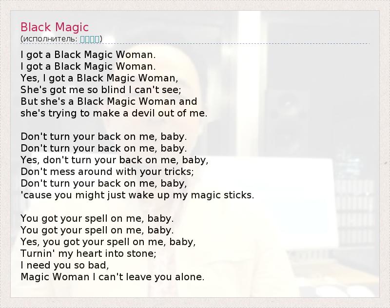 I got a Black Magic Woman. I got a Black Magic Woman. Yes, I got a Black Magic Woman, She's got me so blind I can't see; But she's a Black Magic Woman and she's trying to make a devil out of me. Don't turn your back on me, baby. Don't turn your back on me, baby. Yes, don't turn your back on me, baby, Don't mess around with your tricks; Don't turn your back on me, baby, 'cause you might just wake up my magic sticks. You got your spell on me, baby. You got your spell on me, baby. Yes, you got your spell on me, baby, Turnin' my heart into stone; I need you so bad, Magic Woman I can't leave you alone.