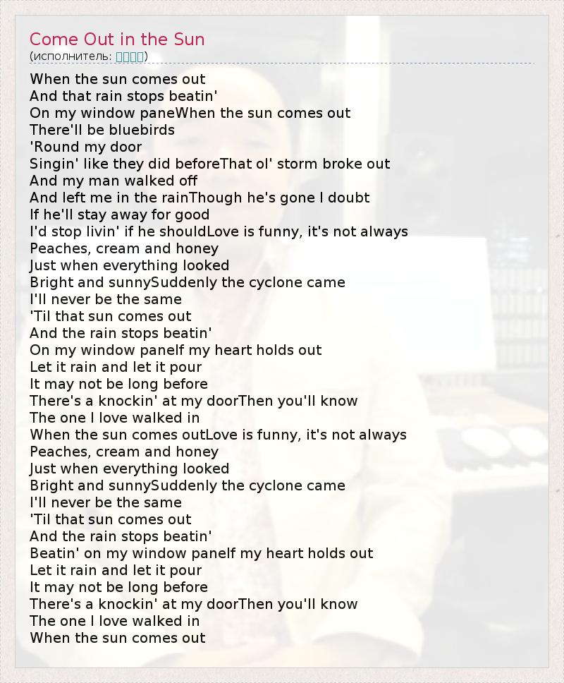 When the sun comes out And that rain stops beatin' On my window paneWhen the sun comes out There'll be bluebirds 'Round my door Singin' like they did beforeThat ol' storm broke out And my man walked off And left me in the rainThough he's gone I doubt If he'll stay away for good I'd stop livin' if he shouldLove is funny, it's not always Peaches, cream and honey Just when everything looked Bright and sunnySuddenly the cyclone came I'll never be the same 'Til that sun comes out And the rain stops beatin' On my window paneIf my heart holds out Let it rain and let it pour It may not be long before There's a knockin' at my doorThen you'll know The one I love walked in When the sun comes outLove is funny, it's not always Peaches, cream and honey Just when everything looked Bright and sunnySuddenly the cyclone came I'll never be the same 'Til that sun comes out And the rain stops beatin' Beatin' on my window paneIf my heart holds out Let it rain and let it pour It may not be long before There's a knockin' at my doorThen you'll know The one I love walked in When the sun comes out