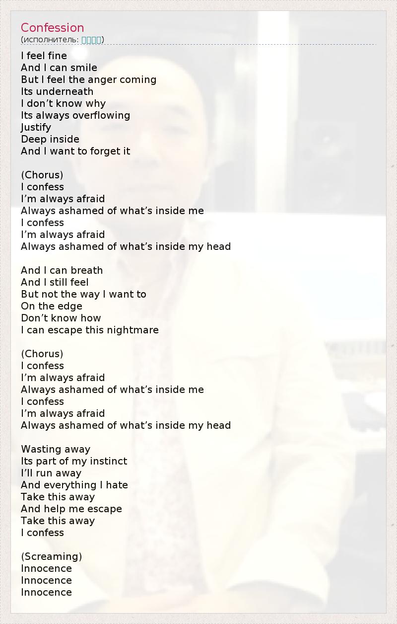 Я чувствую себя прекрасно И я могу улыбнуться Но я чувствую, что гнев прибывает Он на подходе Я не знаю почему Он всегда переполняет меня Объяснение Глубоко внутри И я хочу забыть это (Припев) Я признаюсь, что Я всегда боюсь Всегда стыжусь того, что во мне Я признаюсь, что Я всегда боюсь Всегда стыжусь того, что у меня на уме И я могу вздохнуть И я все еще чувствую Но не так я хочу оказаться На краю Не знаю как Мне избежать этого кошмара (Припев) Я признаюсь, что Я всегда боюсь Всегда стыжусь того, что во мне Я признаюсь, что Я всегда боюсь Всегда стыжусь того, что у меня на уме Я высыхаю Это часть моего инстинкта Я убегу И все, что я ненавижу Забери Помоги мне убежать Забери Я признаюсь (Крик) Я невиновен Я невиновен Я невиновен