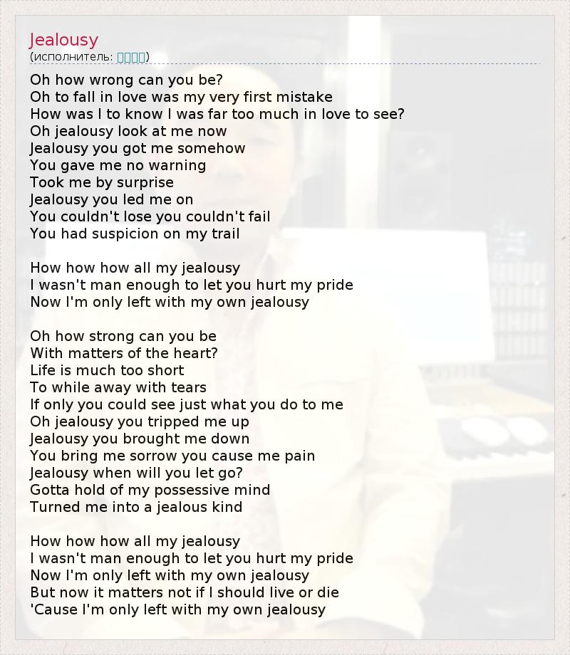 Oh how wrong can you be? Oh to fall in love was my very first mistake How was I to know I was far too much in love to see? Oh jealousy look at me now Jealousy you got me somehow You gave me no warning Took me by surprise Jealousy you led me on You couldn't lose you couldn't fail You had suspicion on my trail How how how all my jealousy I wasn't man enough to let you hurt my pride Now I'm only left with my own jealousy Oh how strong can you be With matters of the heart? Life is much too short To while away with tears If only you could see just what you do to me Oh jealousy you tripped me up Jealousy you brought me down You bring me sorrow you cause me pain Jealousy when will you let go? Gotta hold of my possessive mind Turned me into a jealous kind How how how all my jealousy I wasn't man enough to let you hurt my pride Now I'm only left with my own jealousy But now it matters not if I should live or die 'Cause I'm only left with my own jealousy